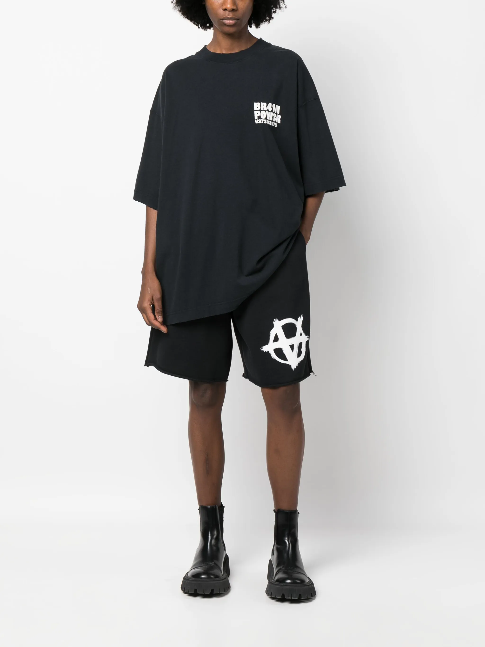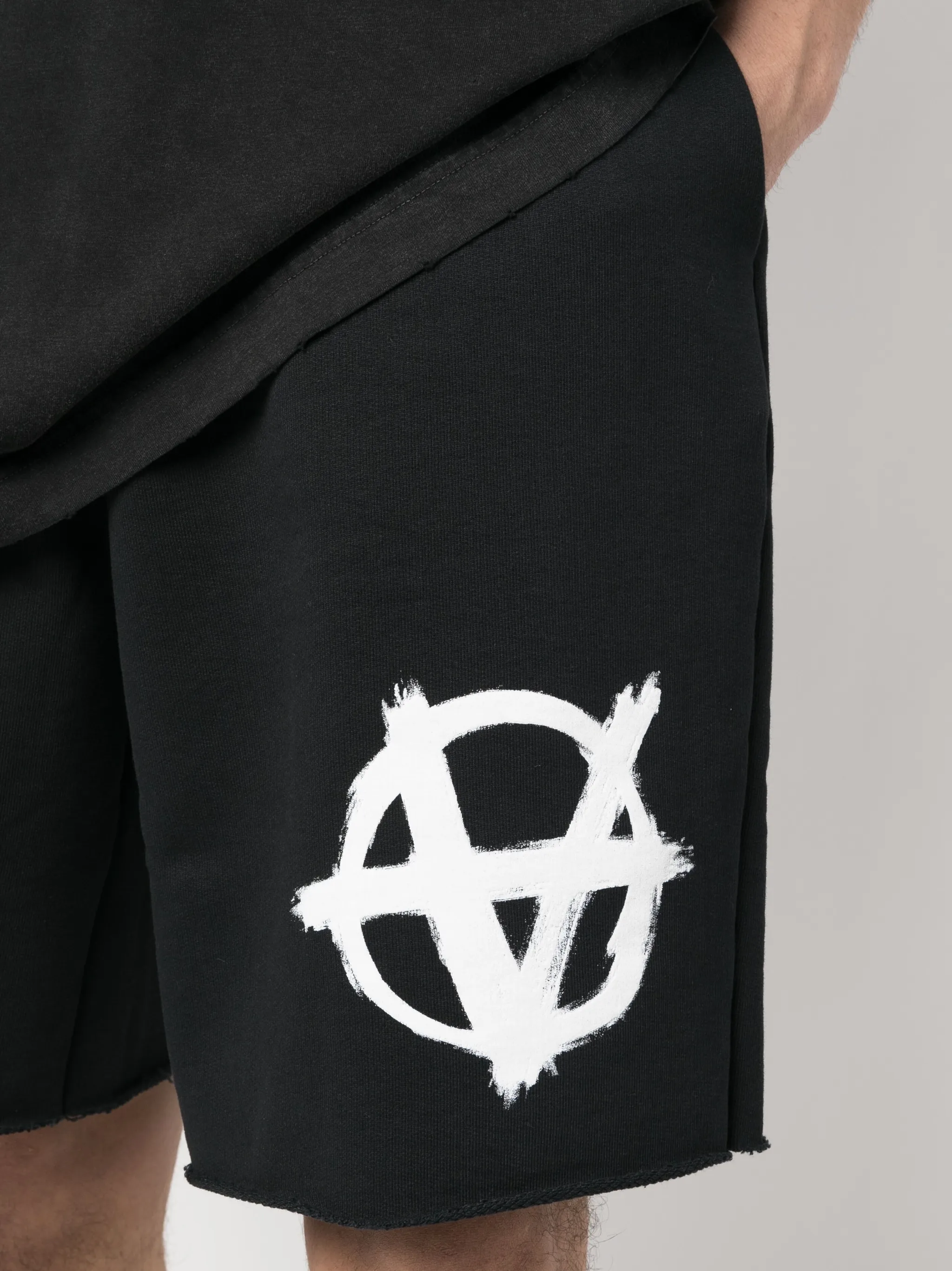 Черный, смесовый хлопок, принт с логотипом, эластичный пояс, два прорезных кармана по бокам, накладной карман сзади и длина по колено. Это унисекс-модель. Обратите внимание, что для нее используется мужская размерная сетка.
