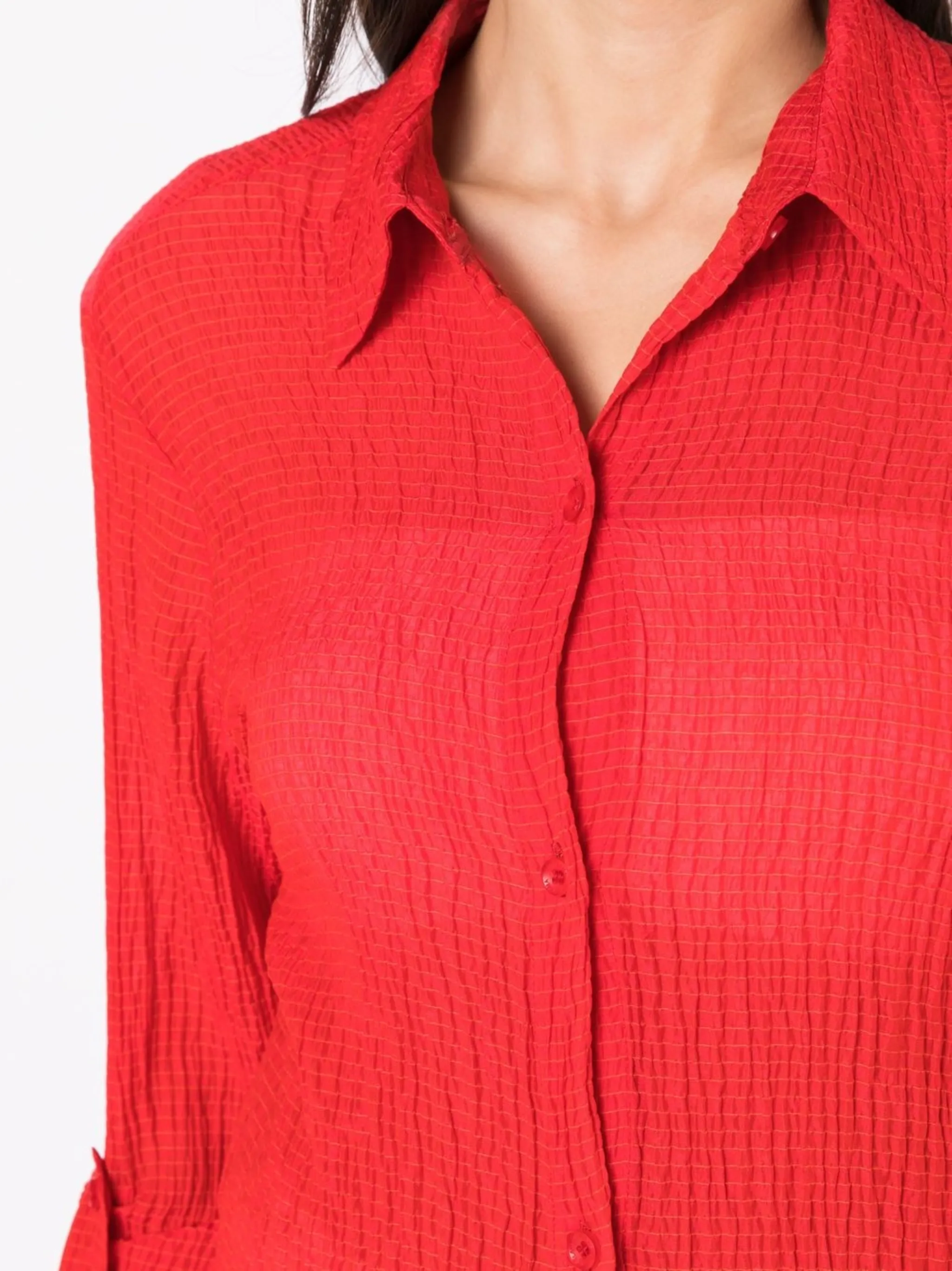 Ярко-красный, шелк, жатый эффект, классический воротник, застежка на пуговицах спереди, длинные рукава, манжеты на пуговицах, боковые разрезы и длина до бедер.