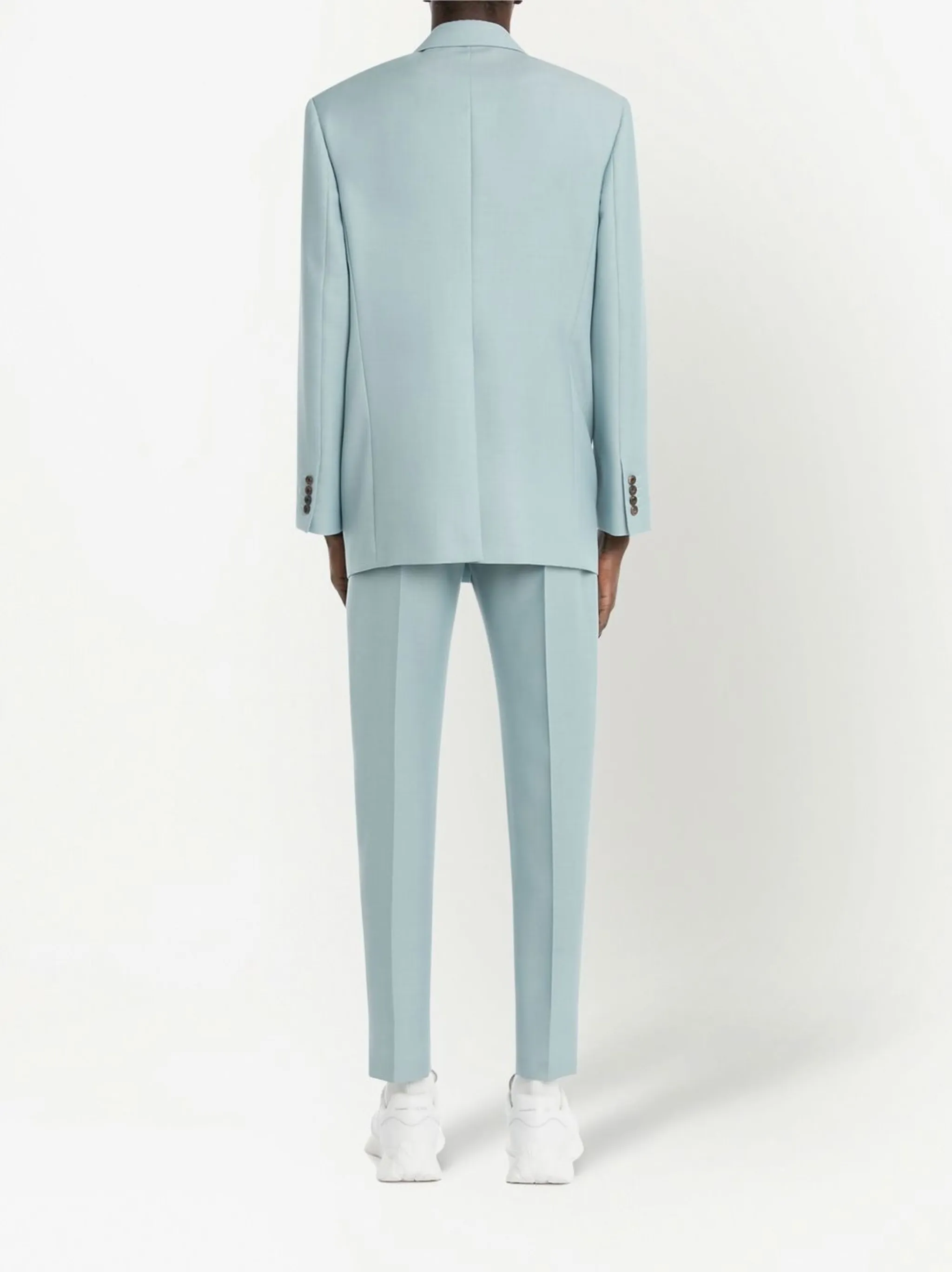 Синий, смесь шерсти и мохера, классический крой, широкие заостренные лацканы, двубортная застежка на кнопки, длинные рукава, манжеты на пуговицах, прорезной карман на груди и два передних кармана с клапанами.