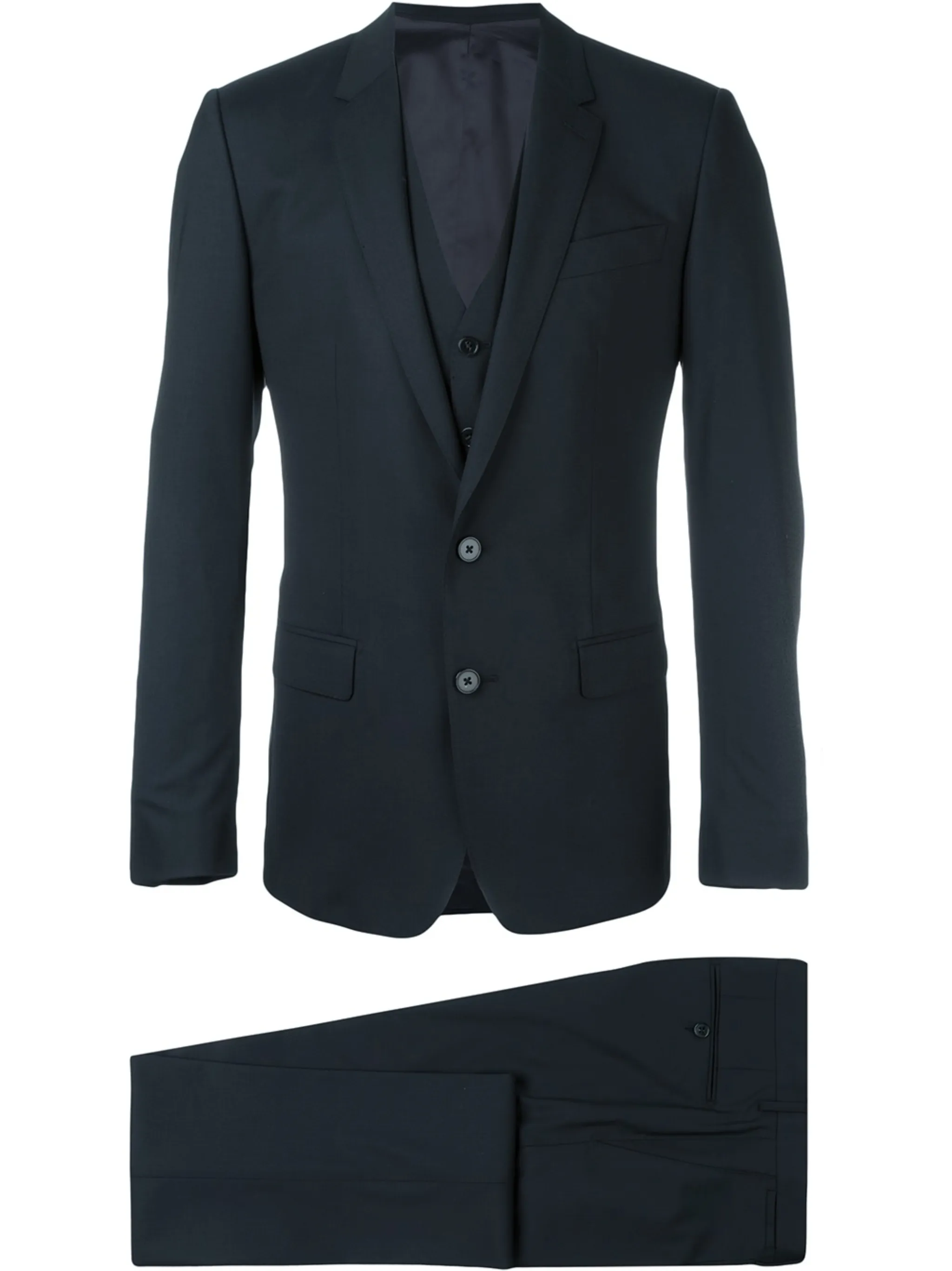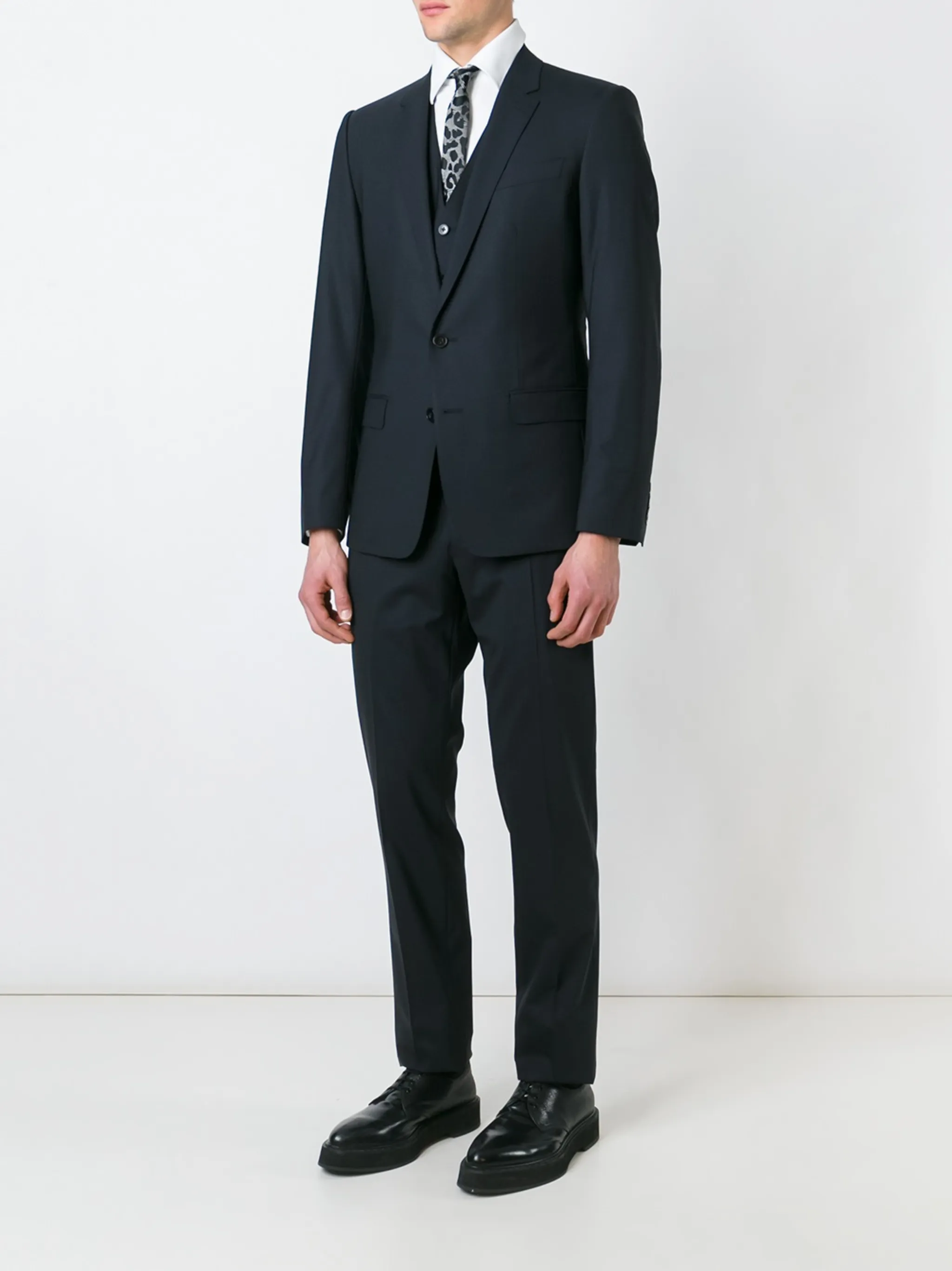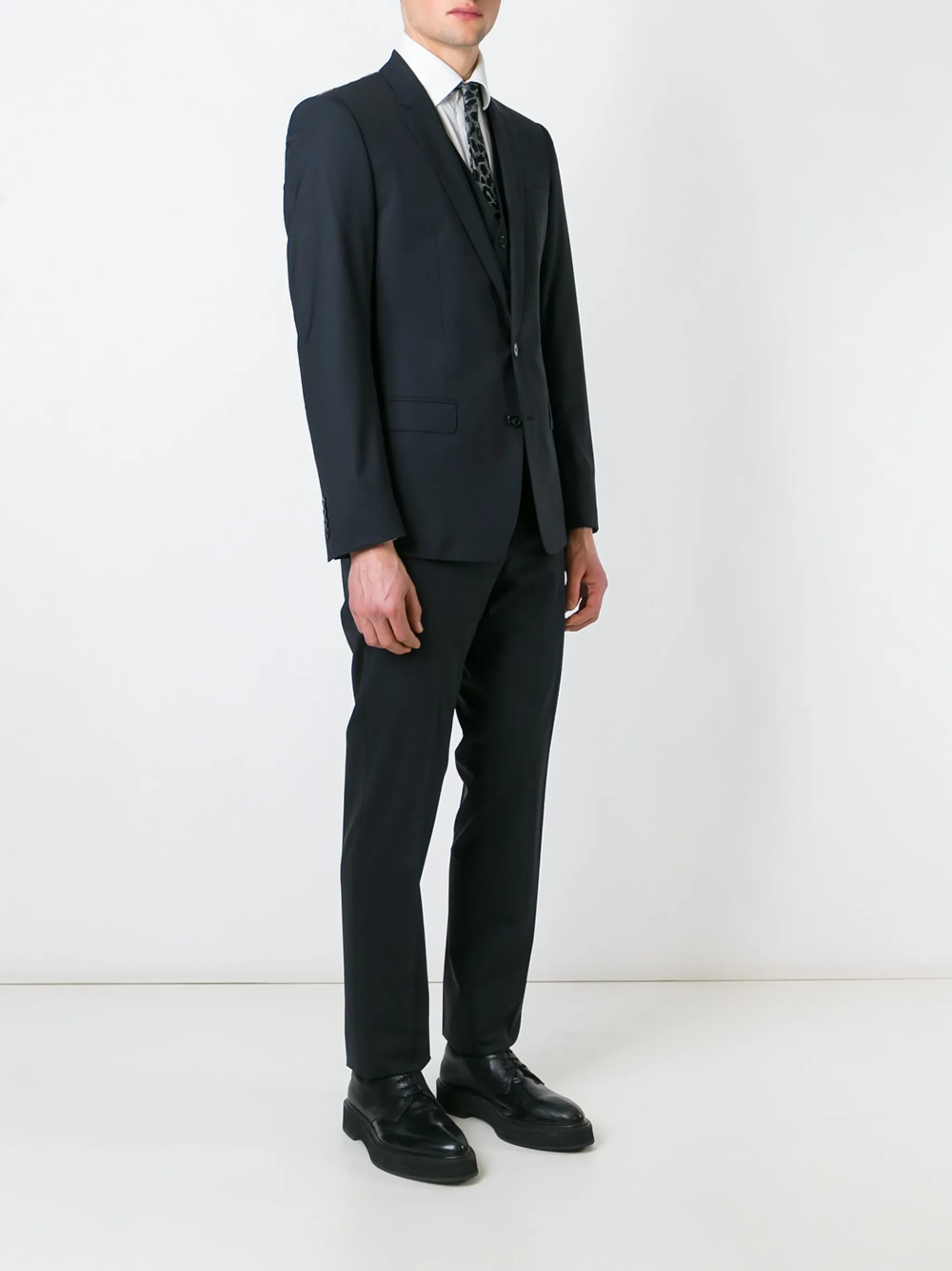 Синий шерстяной костюм-тройка от Dolce & Gabbana. Зазубренные лацканы, широкий карман с листочкой на груди, застёжка на пуговицах спереди, передние карманы с клапанами, длинные рукава, манжеты на пуговицах, шлица сзади, V-образная горловина, дизайн без рукавов, передний карман с листочкой.