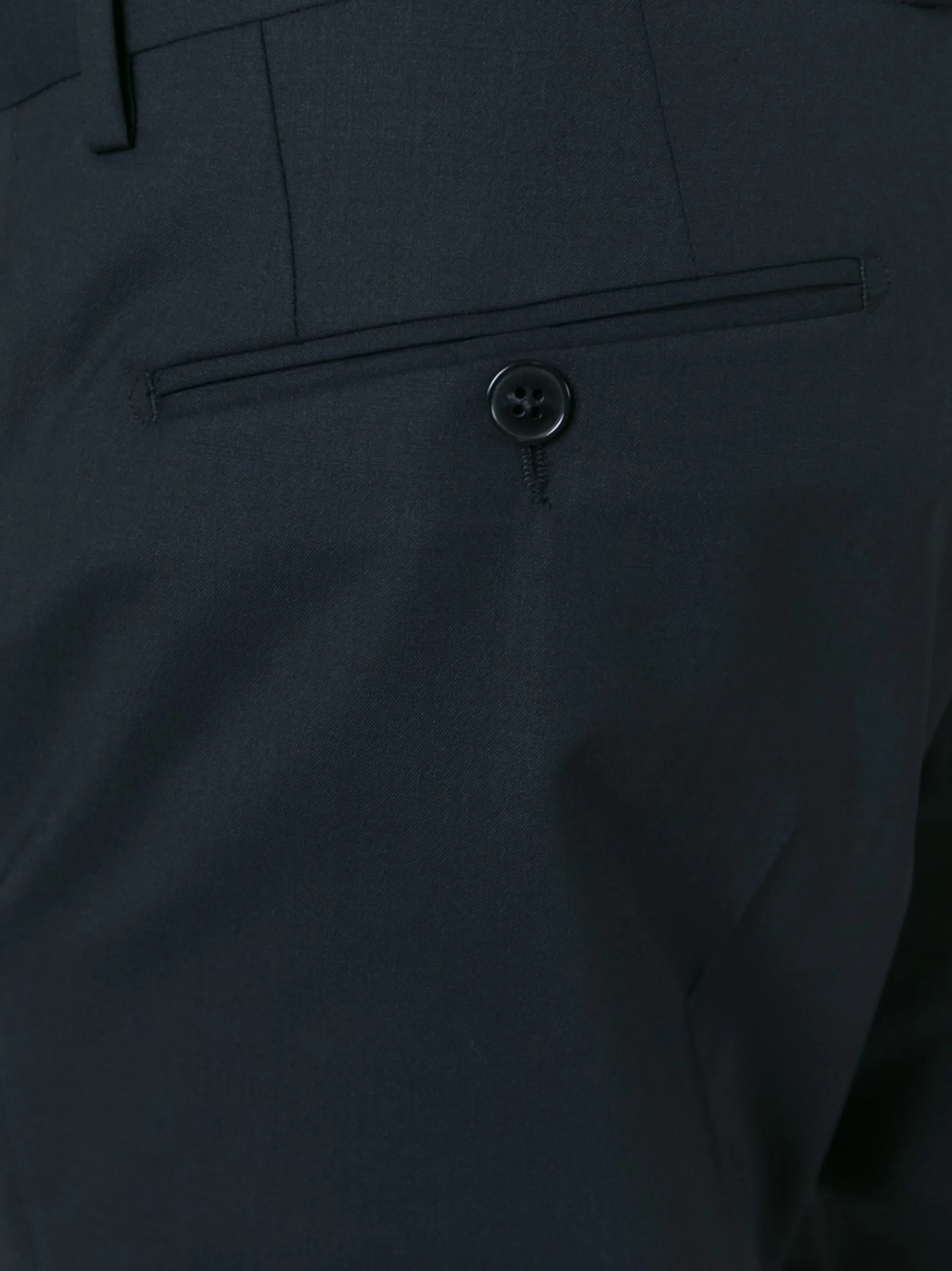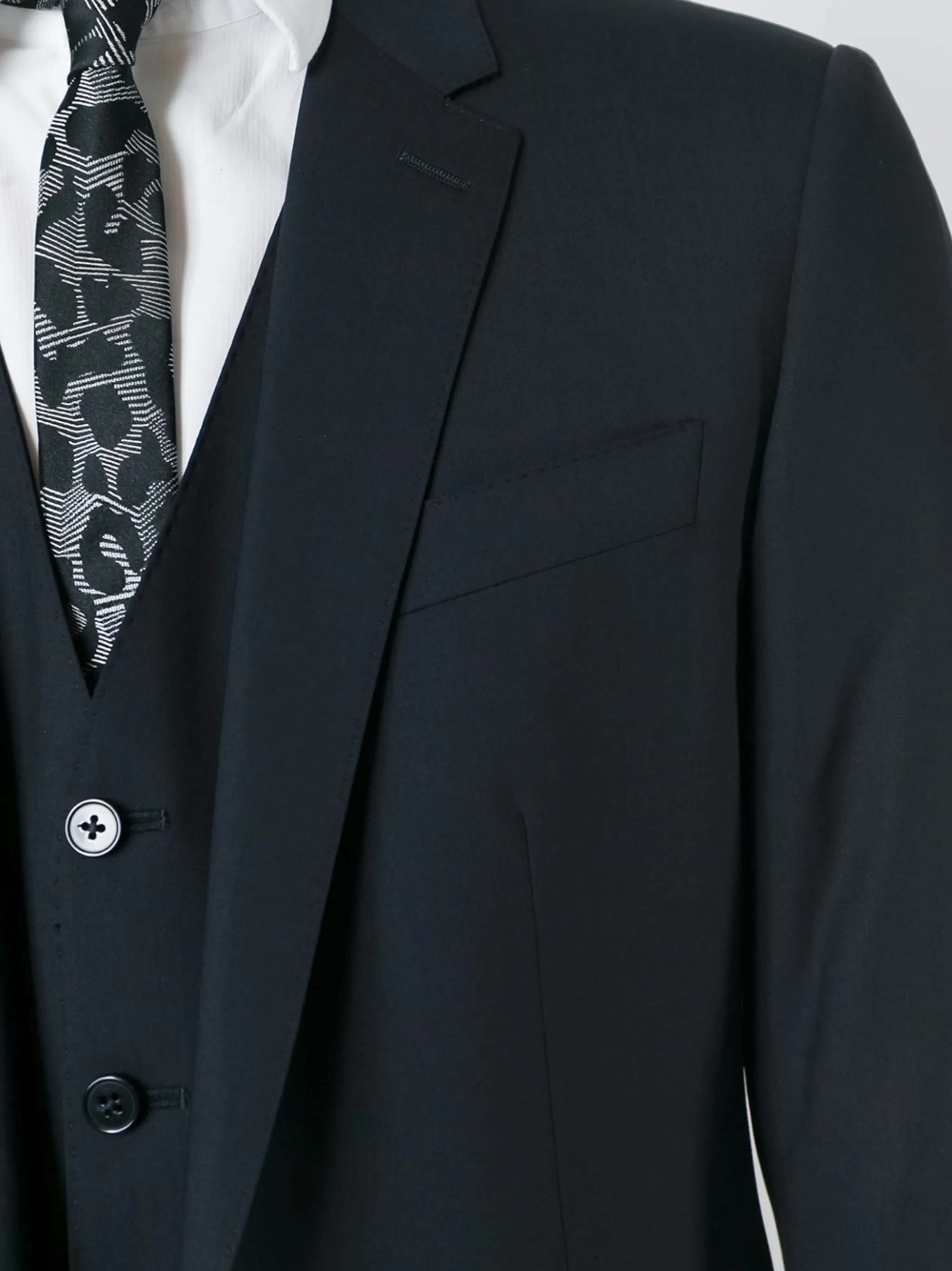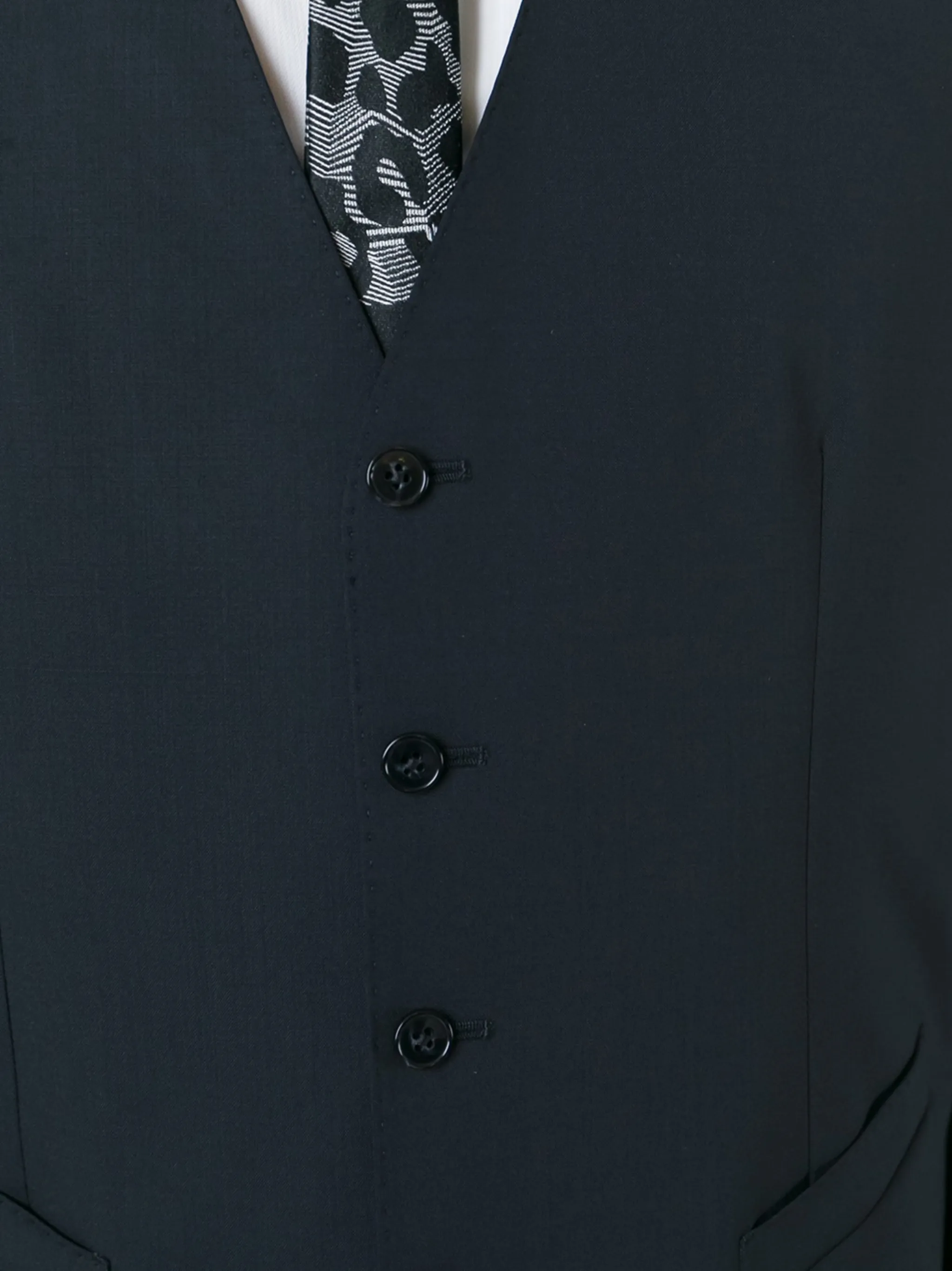 Синий шерстяной костюм-тройка от Dolce & Gabbana. Зазубренные лацканы, широкий карман с листочкой на груди, застёжка на пуговицах спереди, передние карманы с клапанами, длинные рукава, манжеты на пуговицах, шлица сзади, V-образная горловина, дизайн без рукавов, передний карман с листочкой.