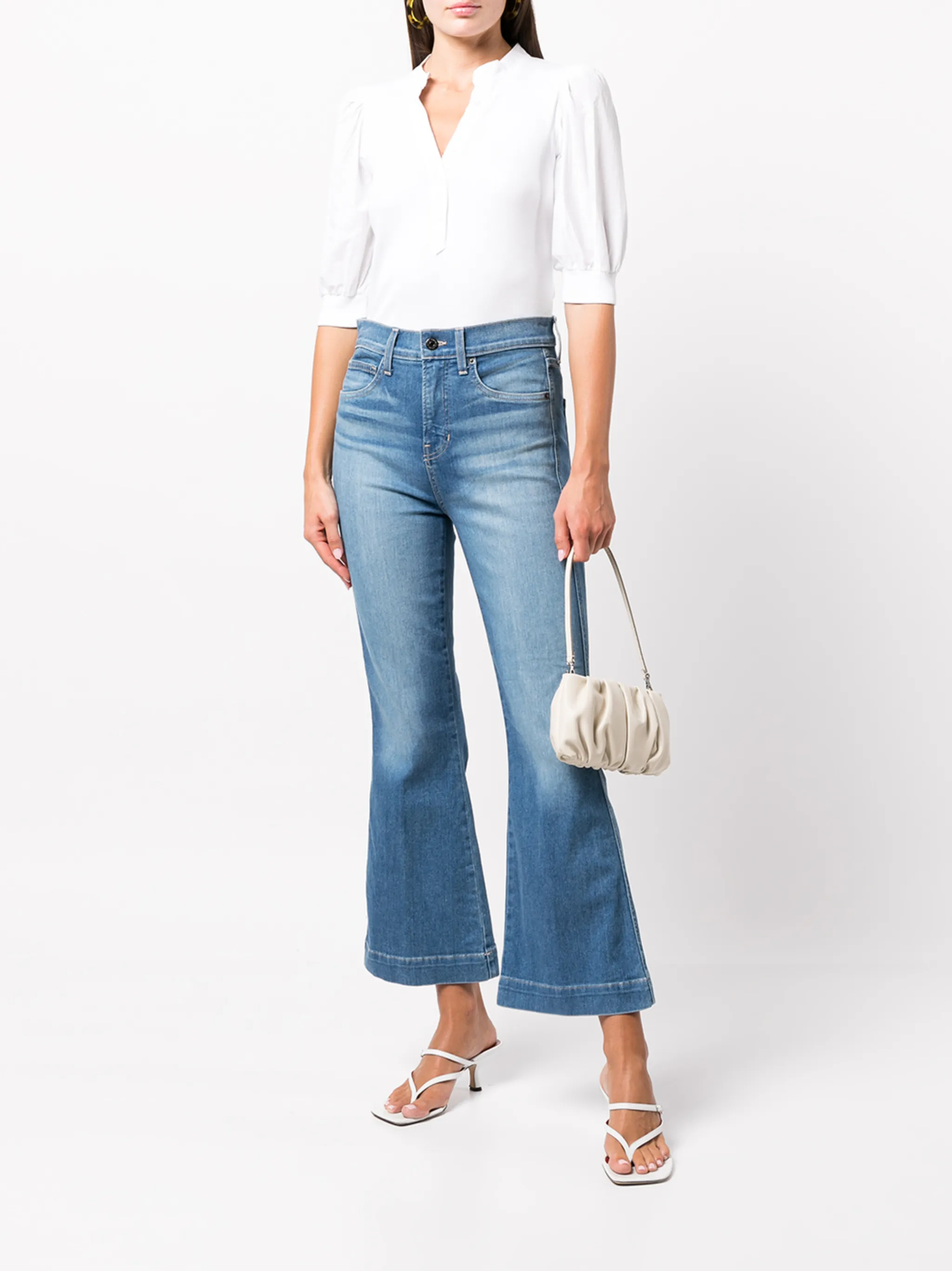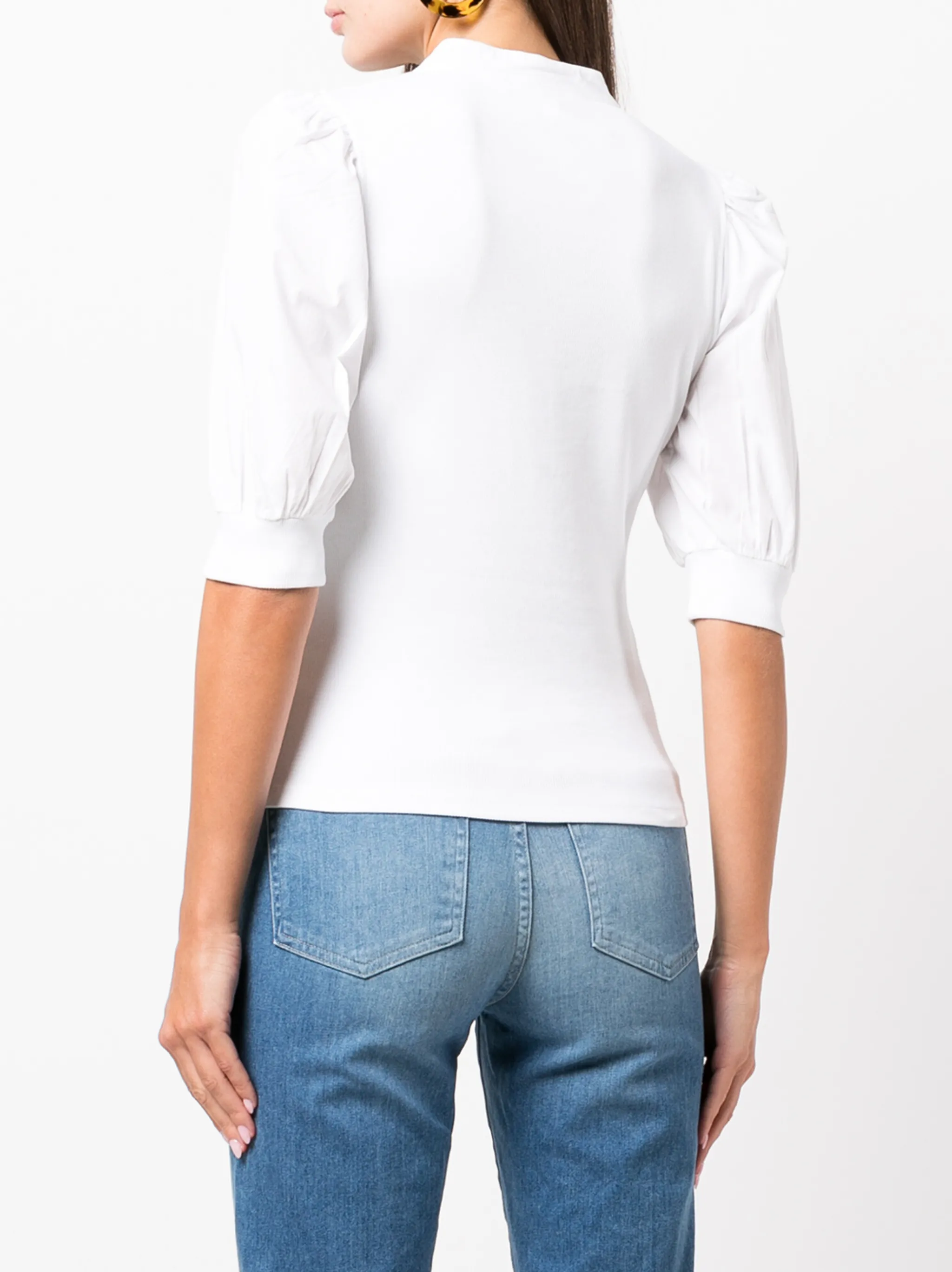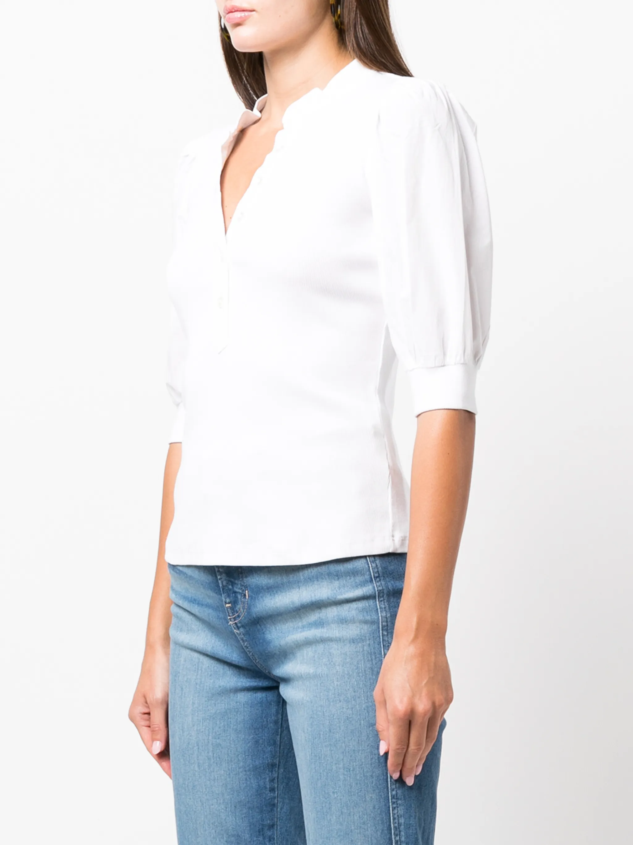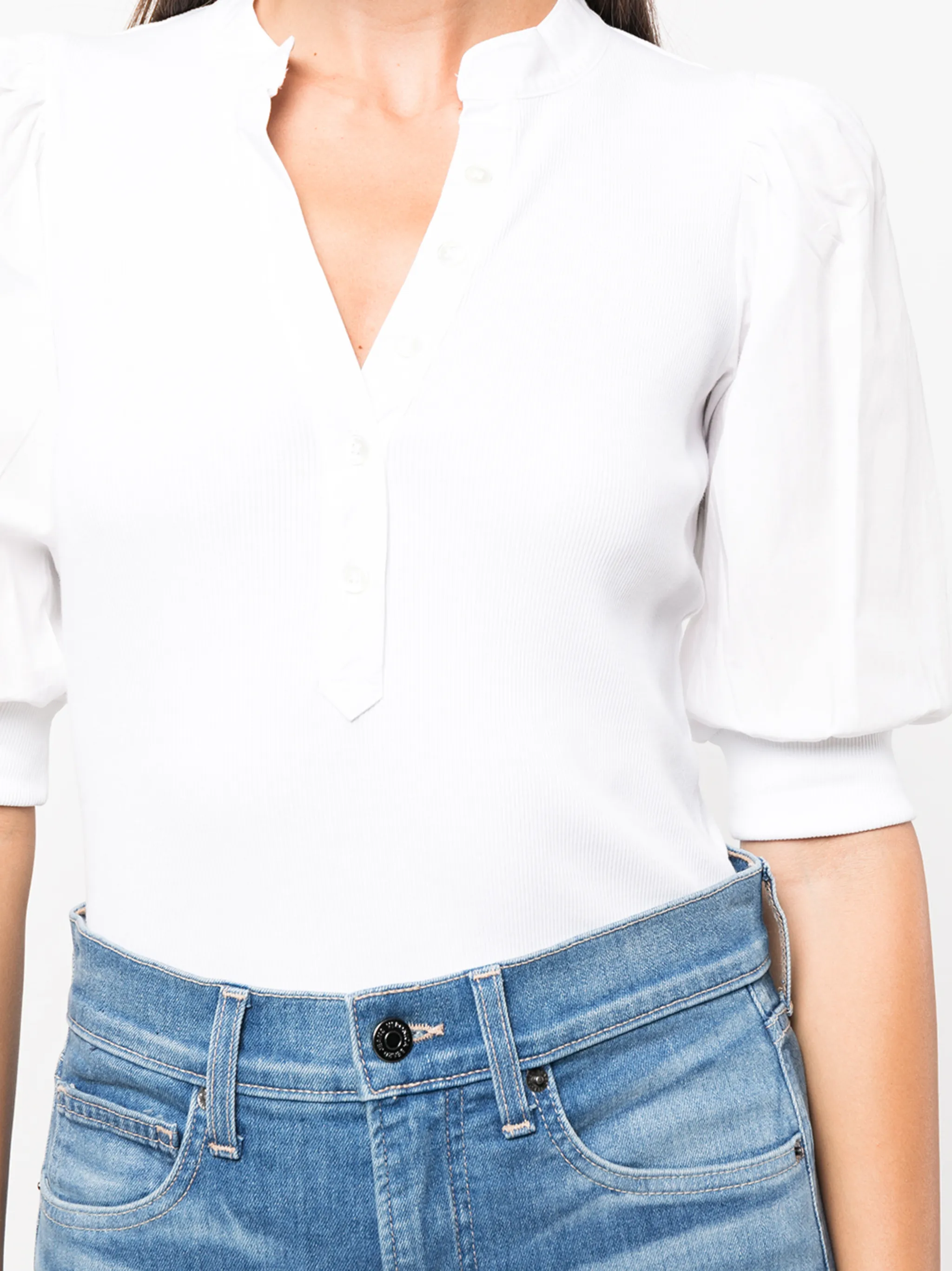 Белый, смесовый хлопок, V-образный вырез, застежка на пуговицы и короткие объемные рукава.