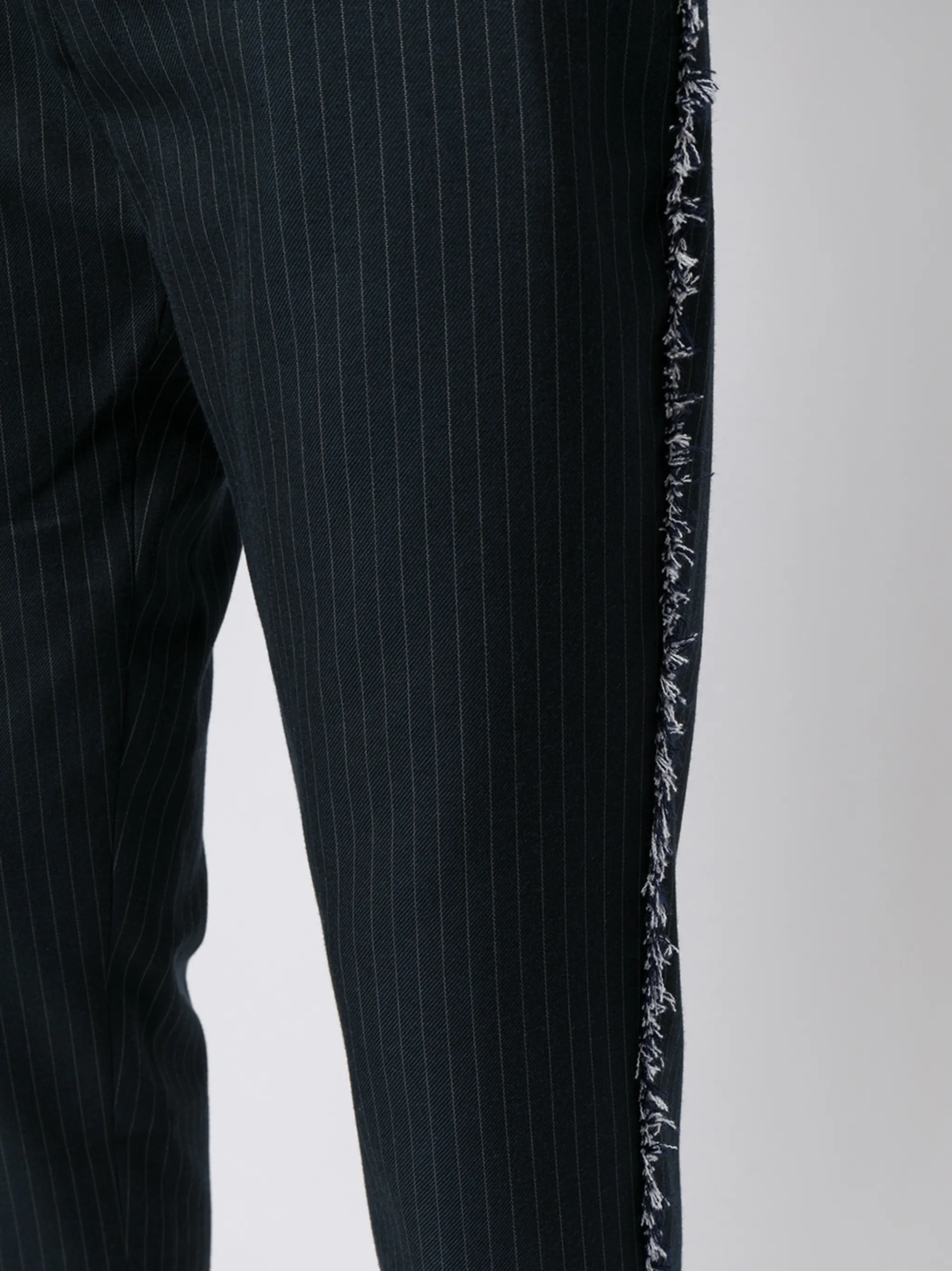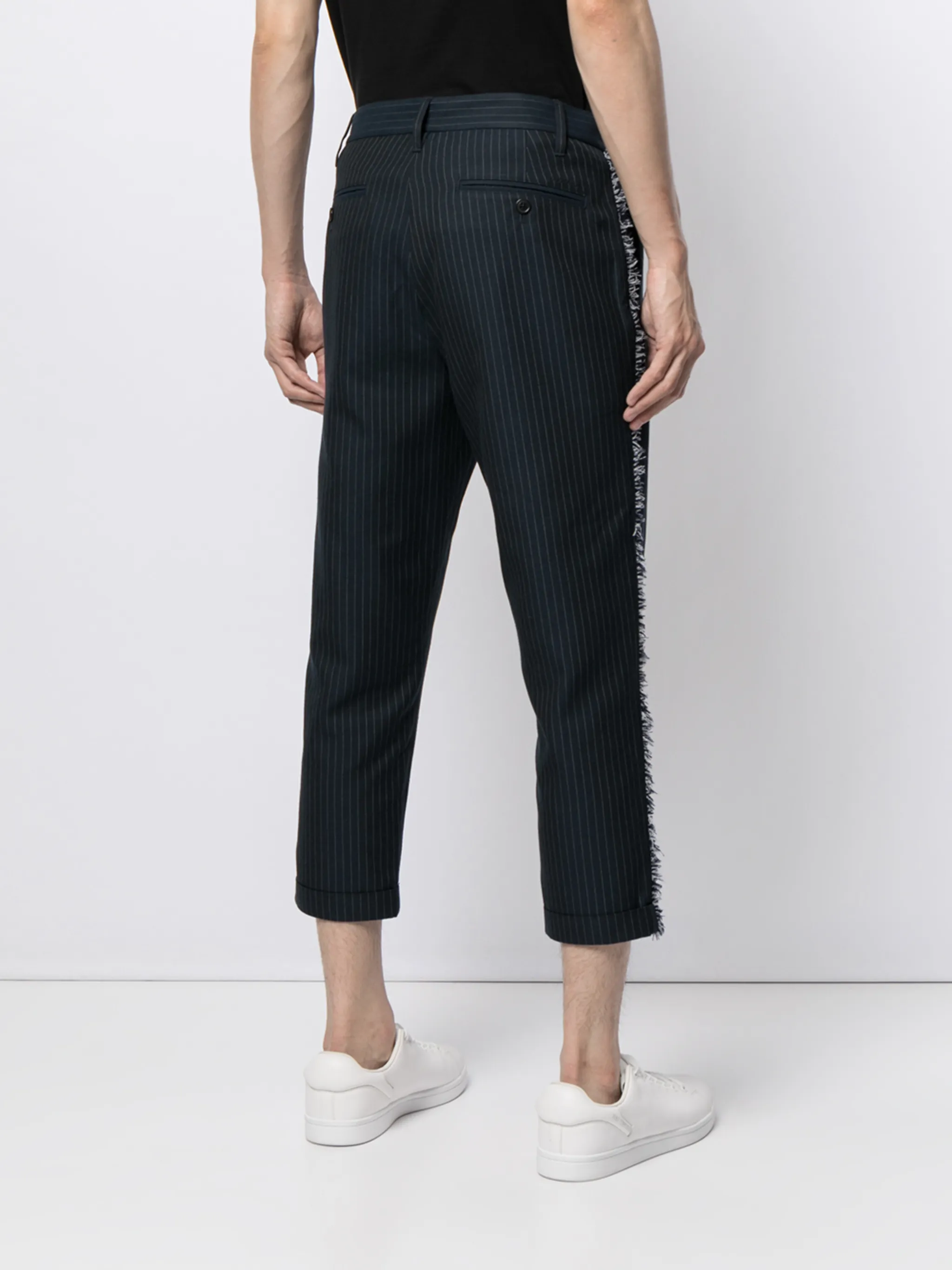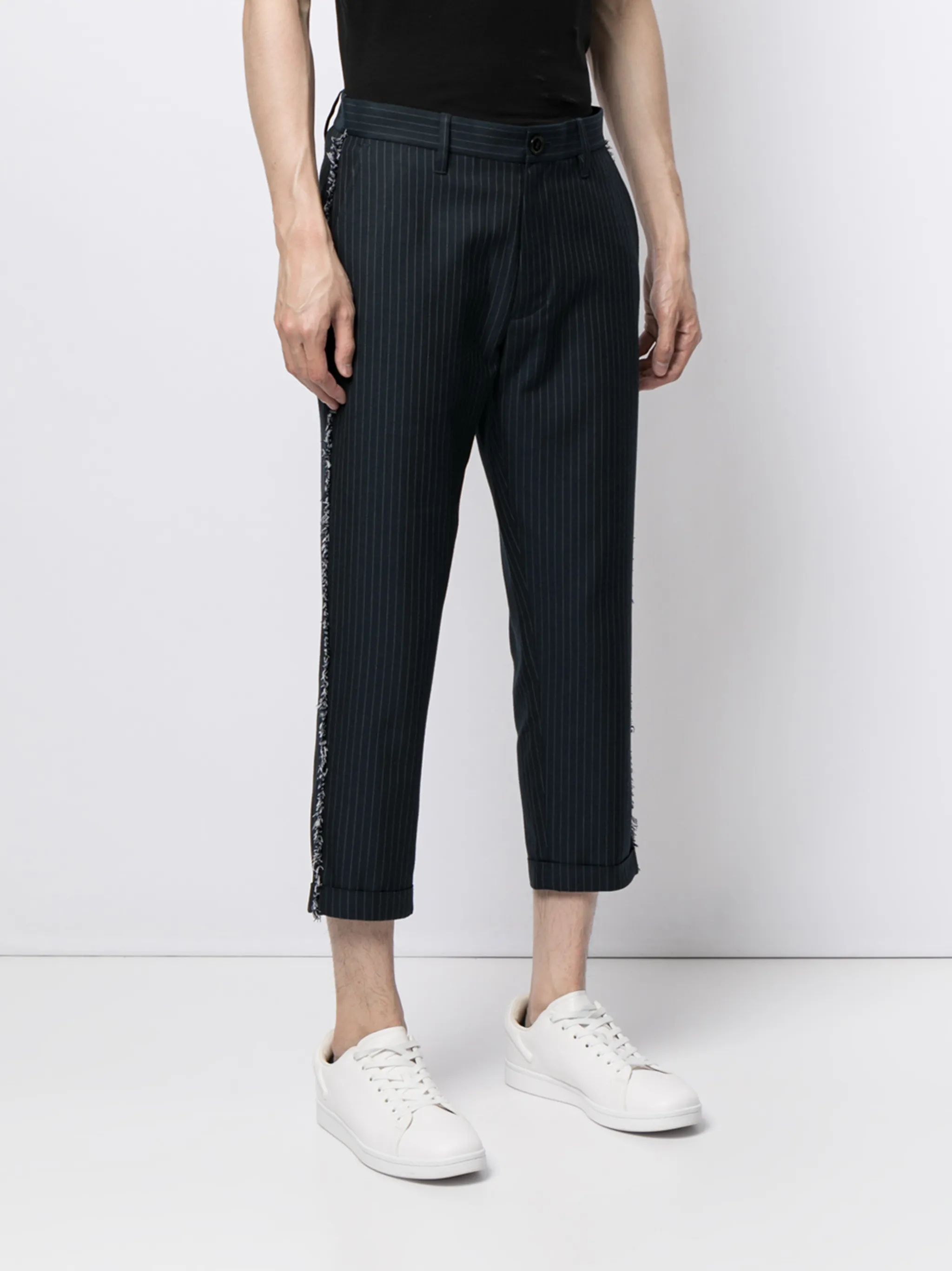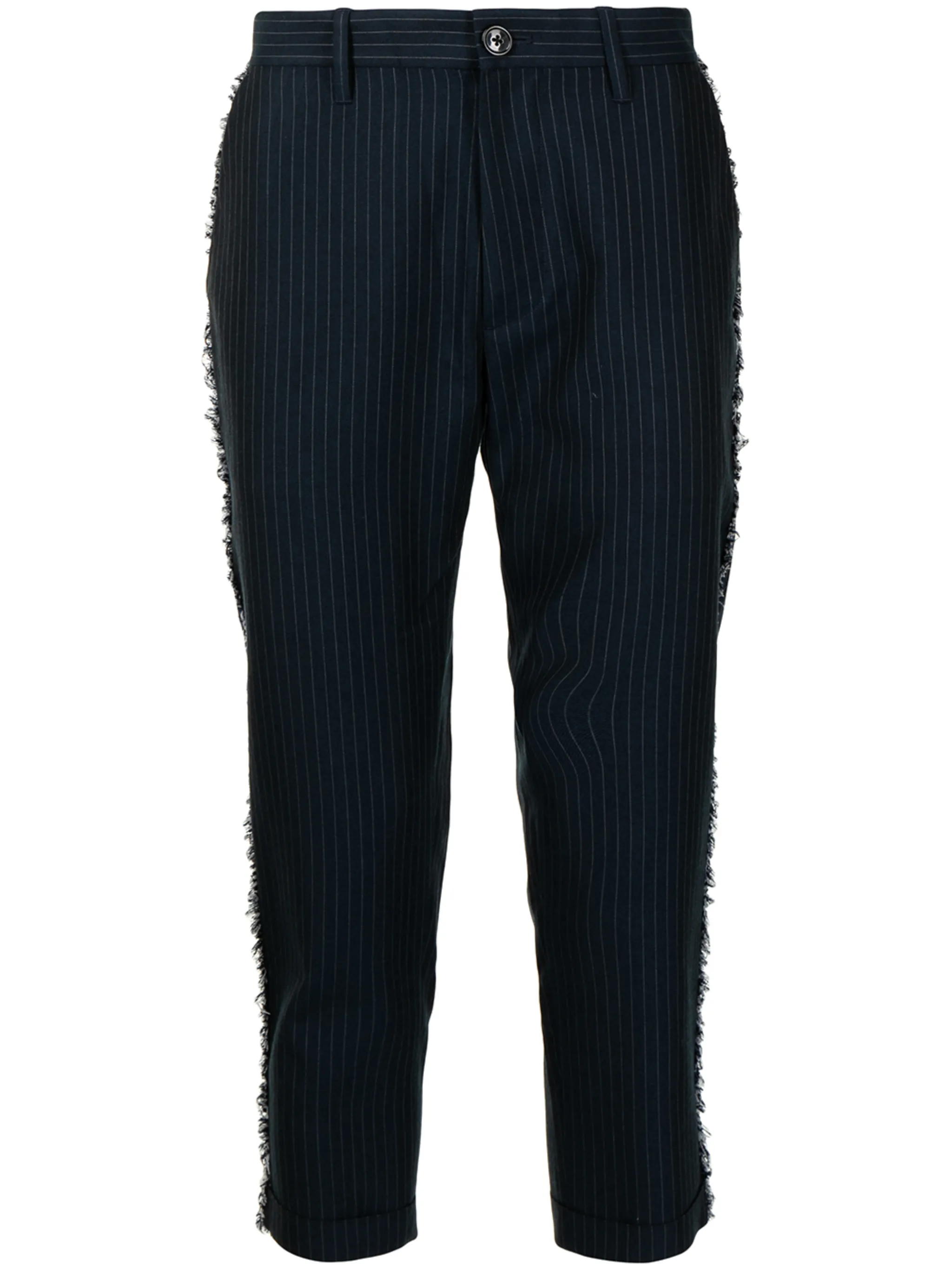 Необработанные края, узор в тонкую полоску, застежка на молнии и пуговице спереди, петли для ремня и укороченная длина.