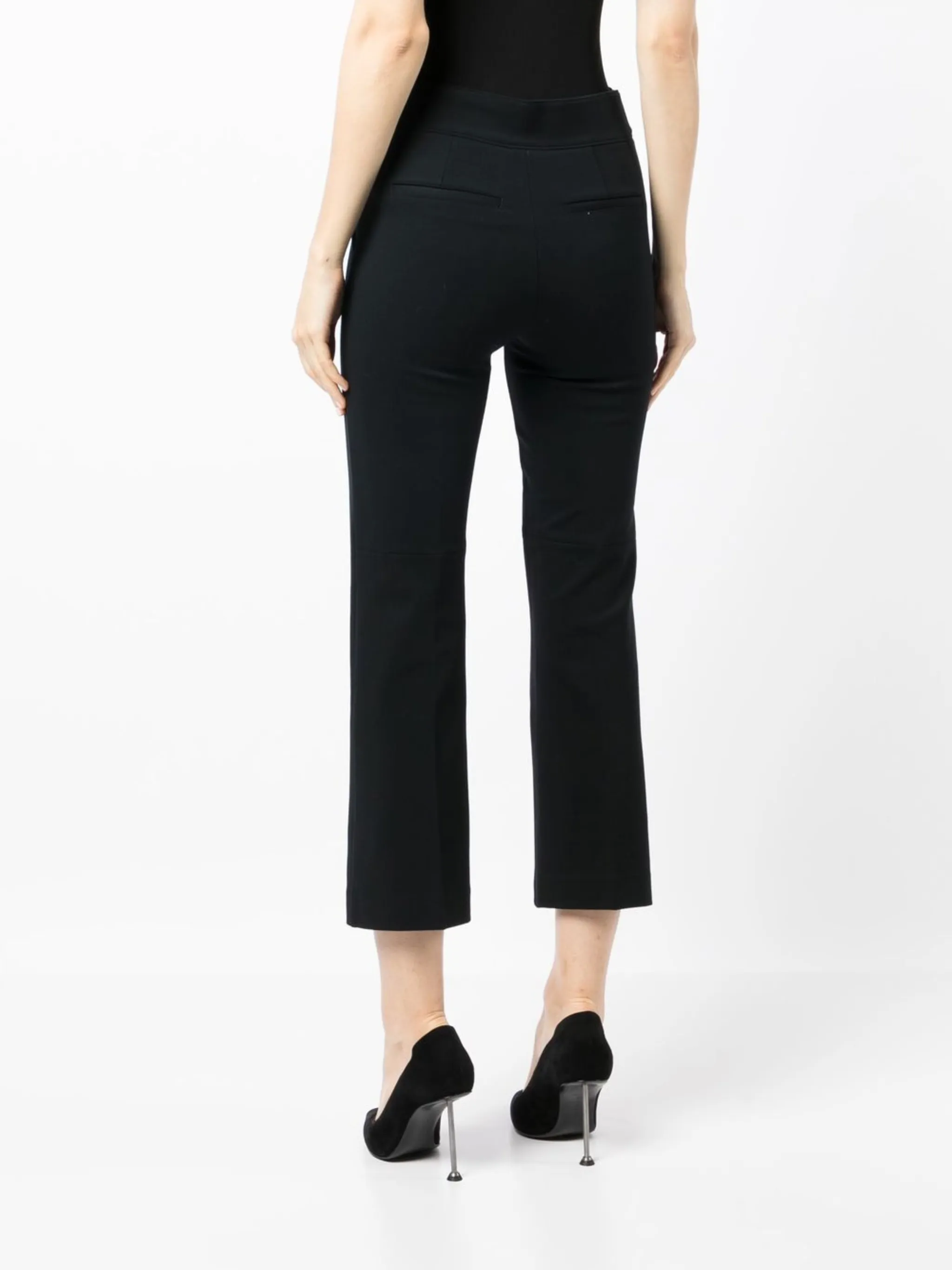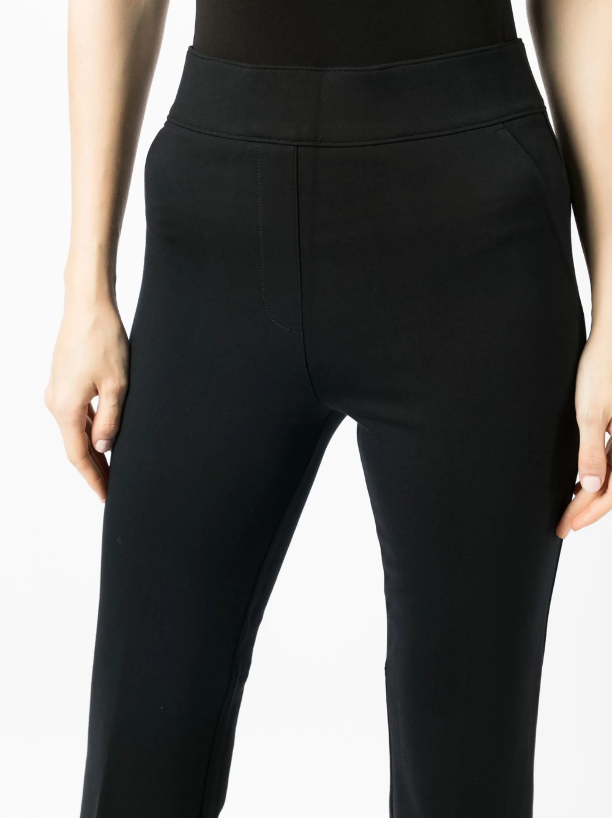 Черный, строгий крой, прямой крой, укороченная длина, завышенная талия, два кармана по бокам, эластичный пояс и два кармана с листочкой сзади.
