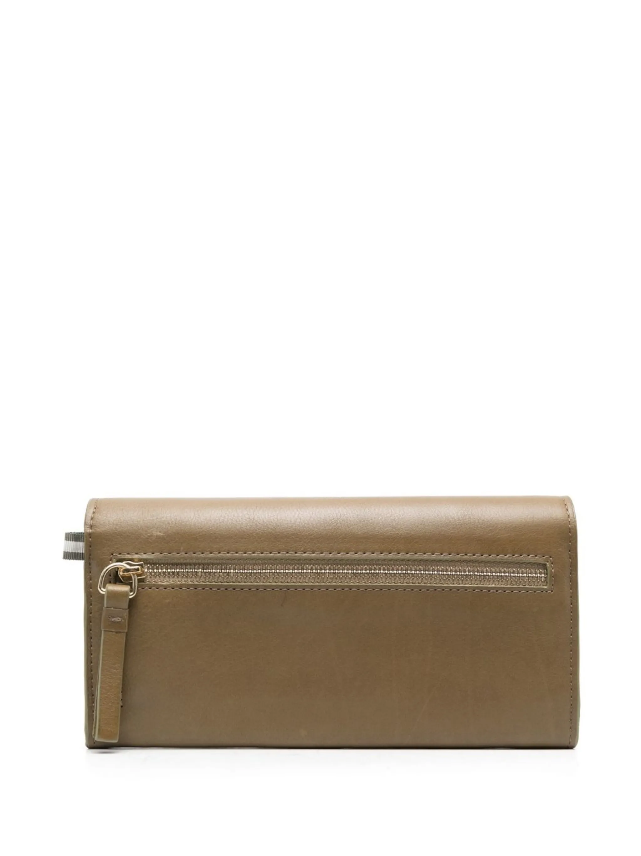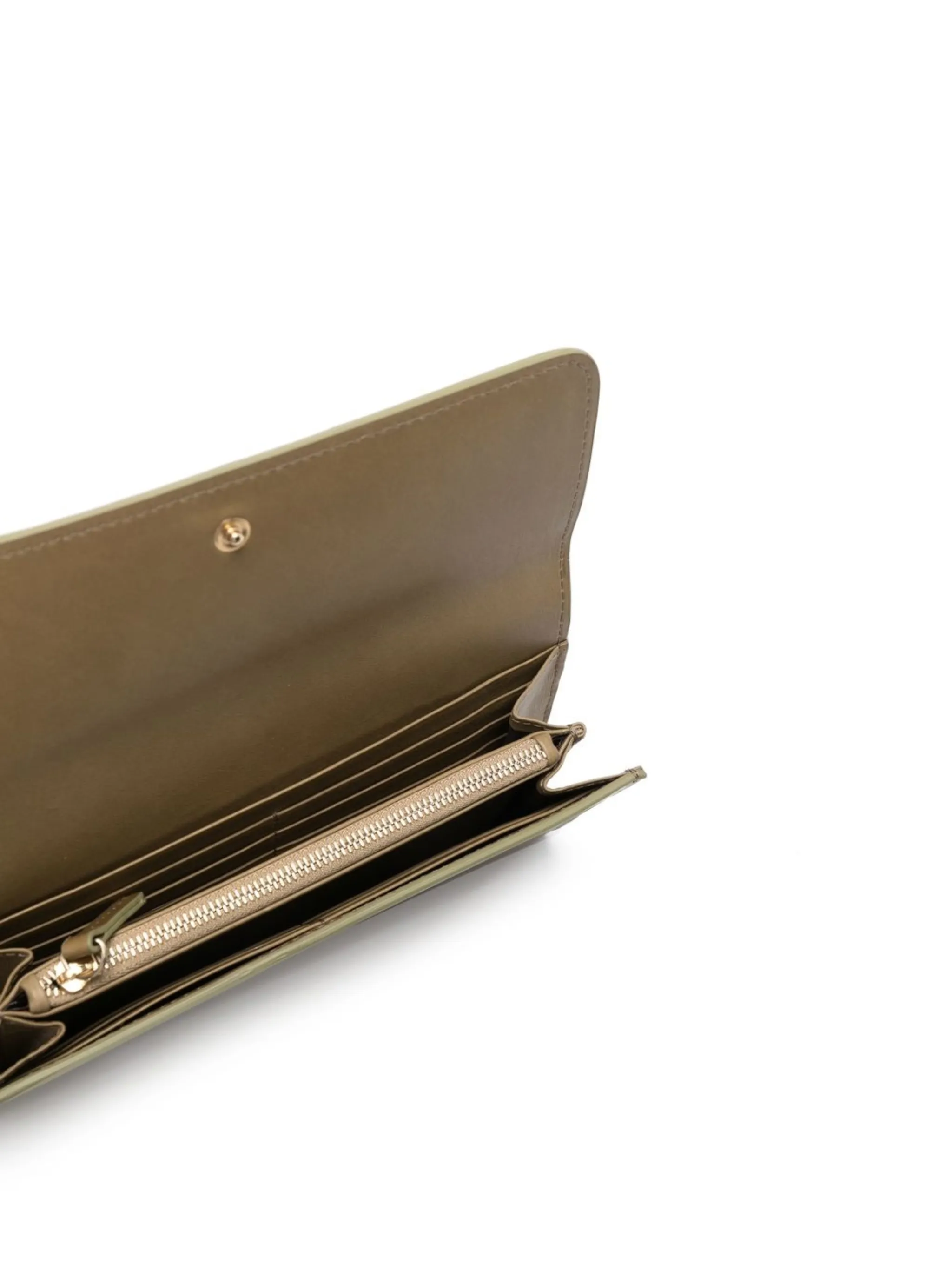 Хаки, телячья кожа, тисненый логотип спереди, откидной верх с застежкой на кнопки, отделение для купюр, внутренние отделения для карт и внутренний карман на молнии.
