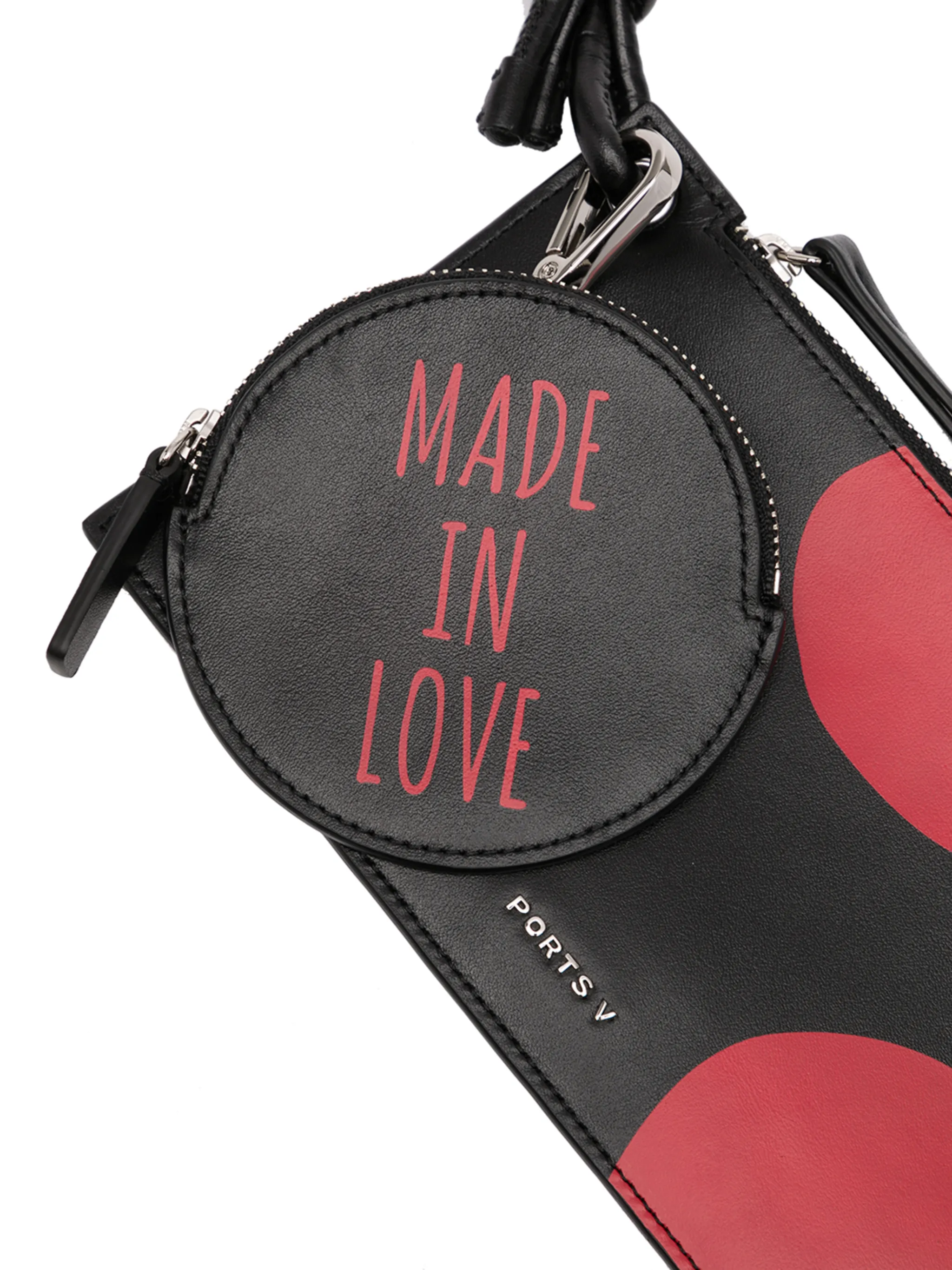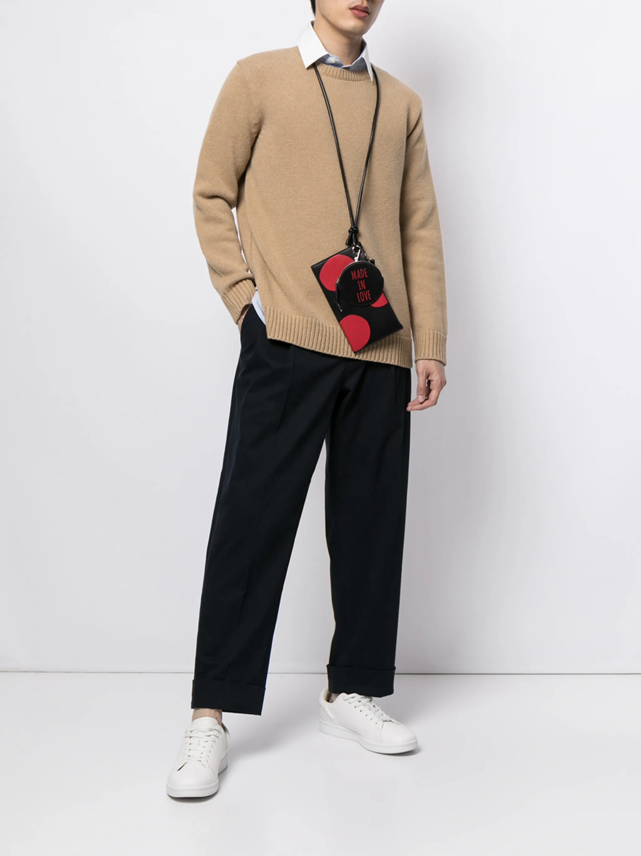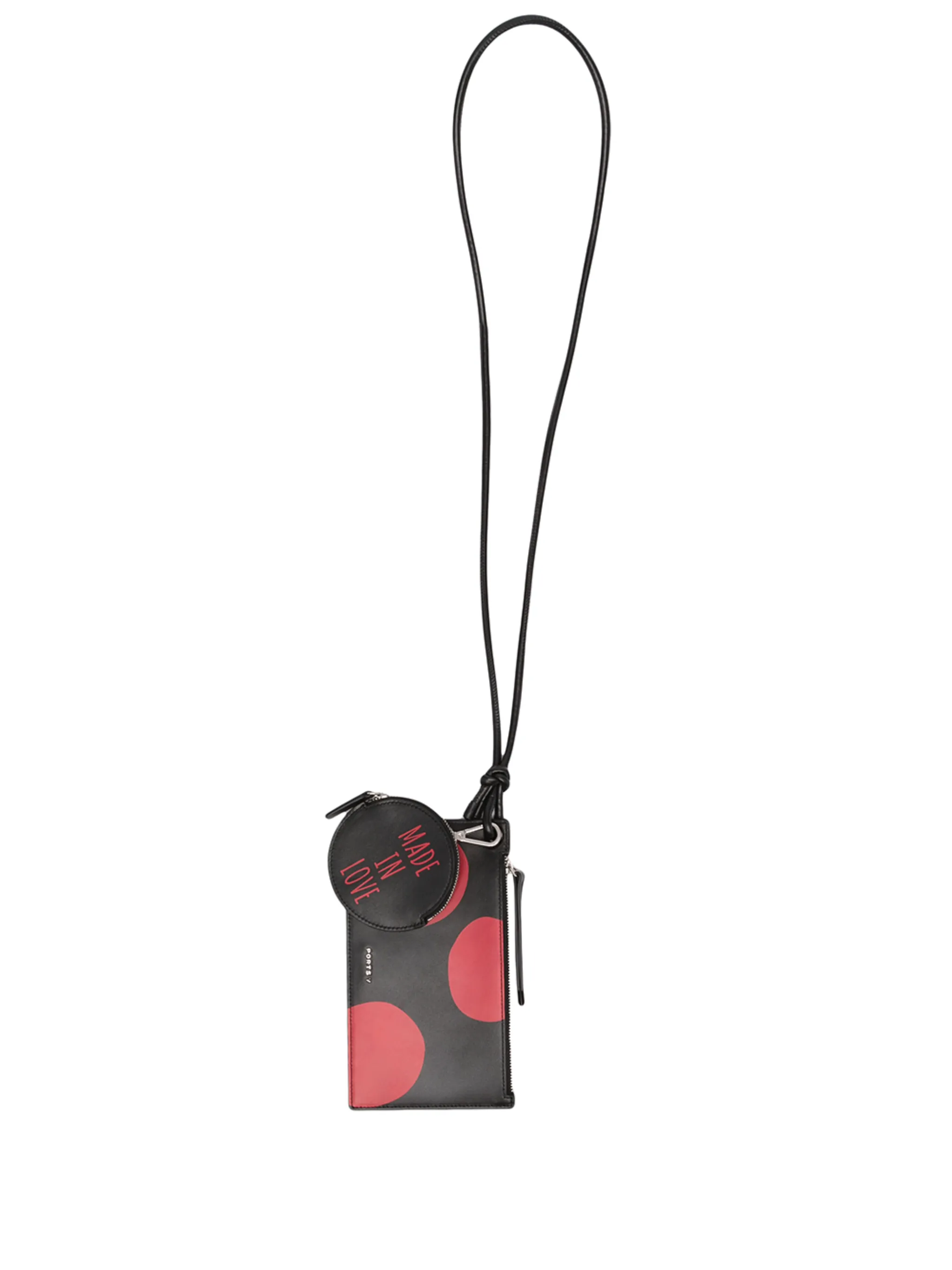 Подвеска с логотипом, принт в горох, застежка на молнии сверху и съемный ремень на шею.