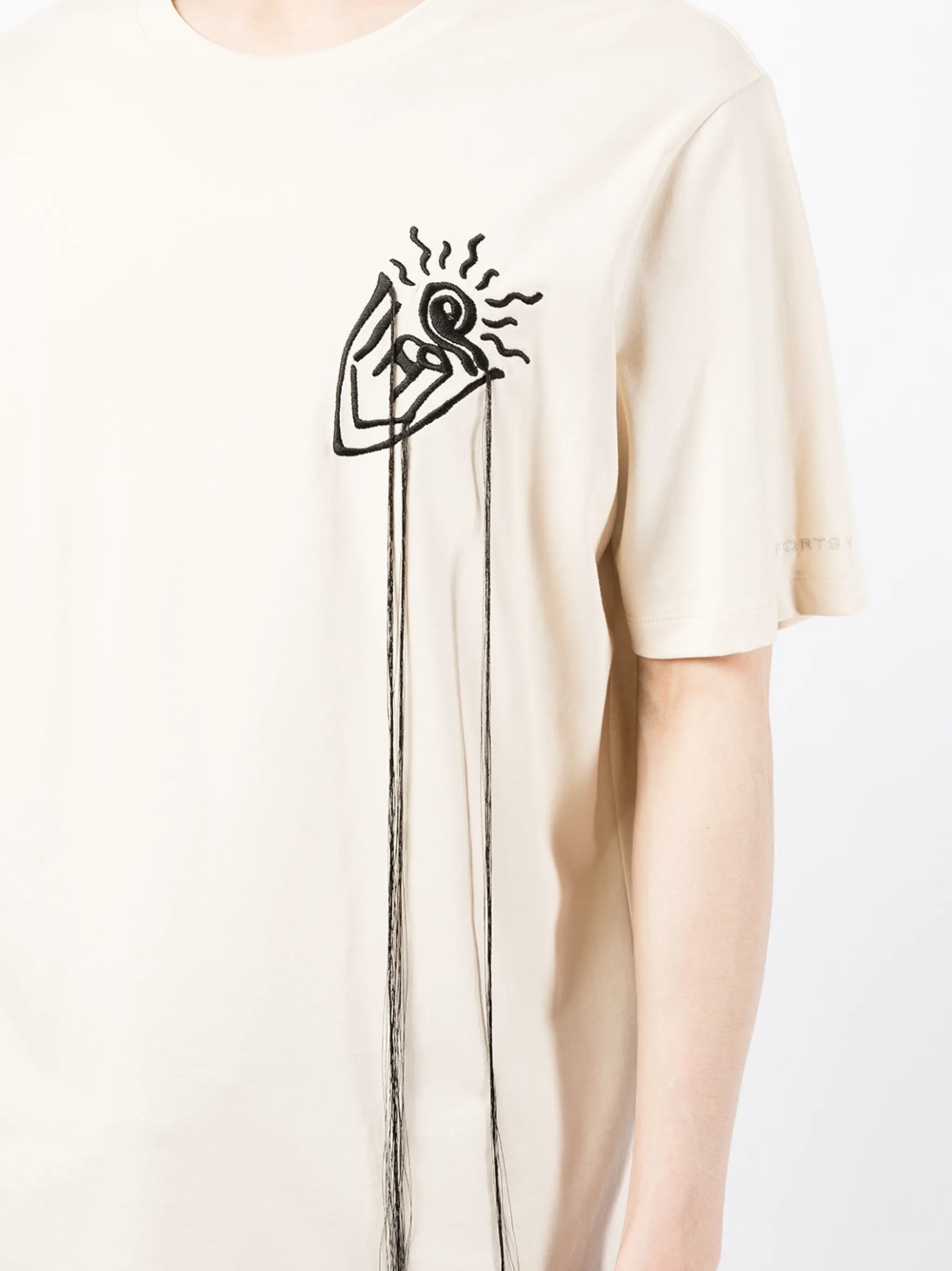 Принт на груди, круглый вырез, короткие рукава и прямой подол.