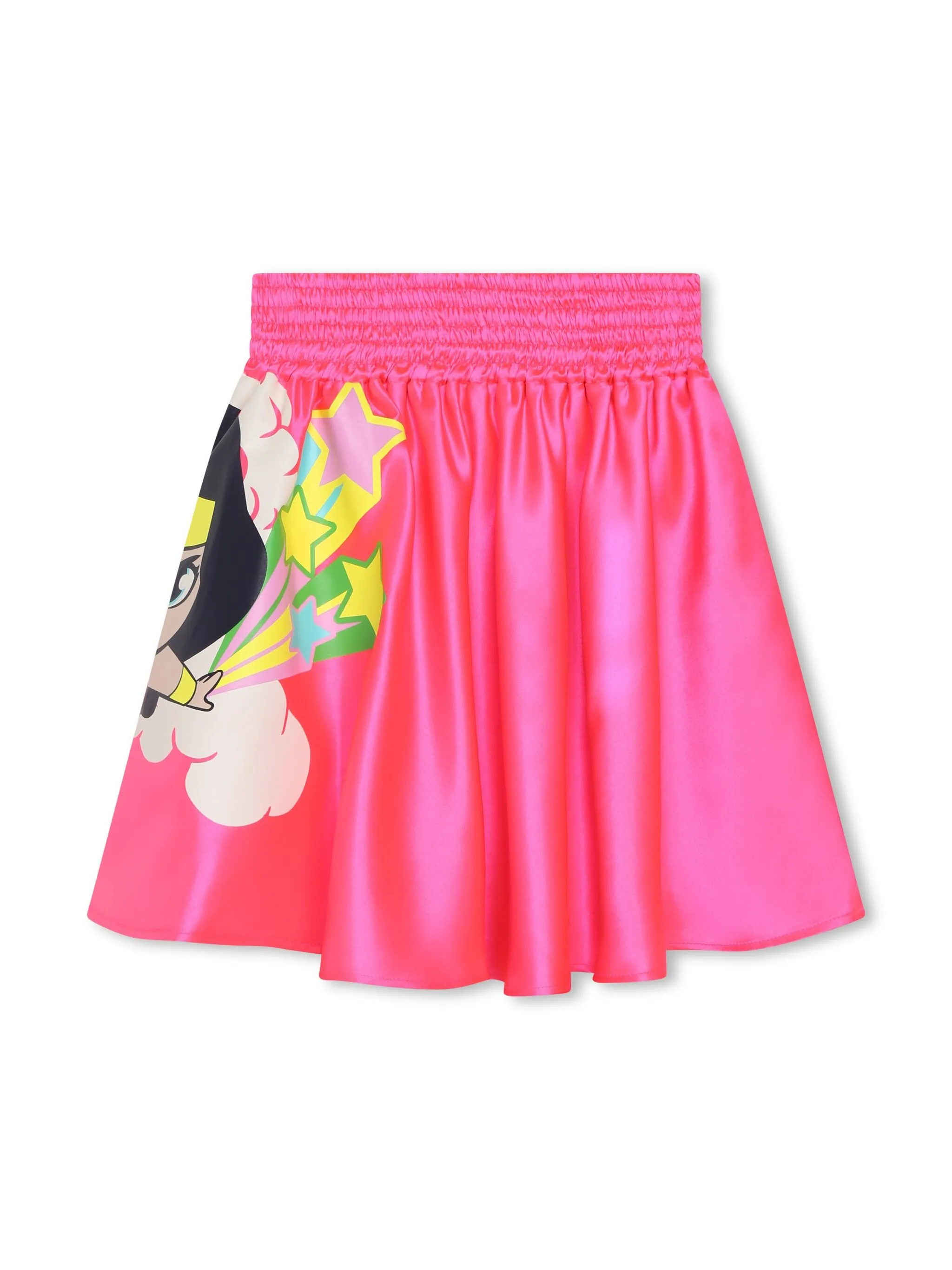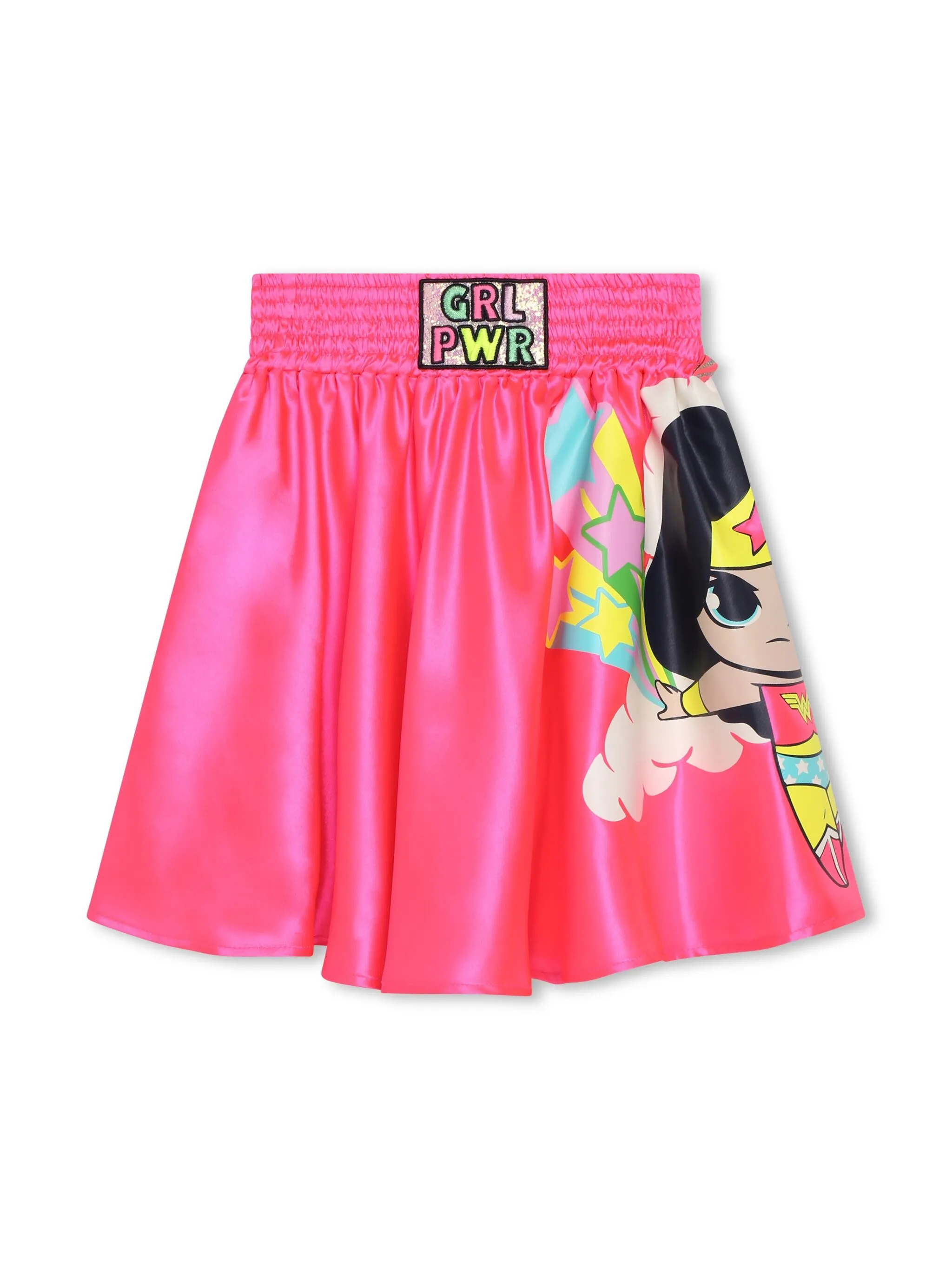 Темно-розовый, мультипликационный принт, нашивка, эластичный пояс, модель без застежки и прямой подол.