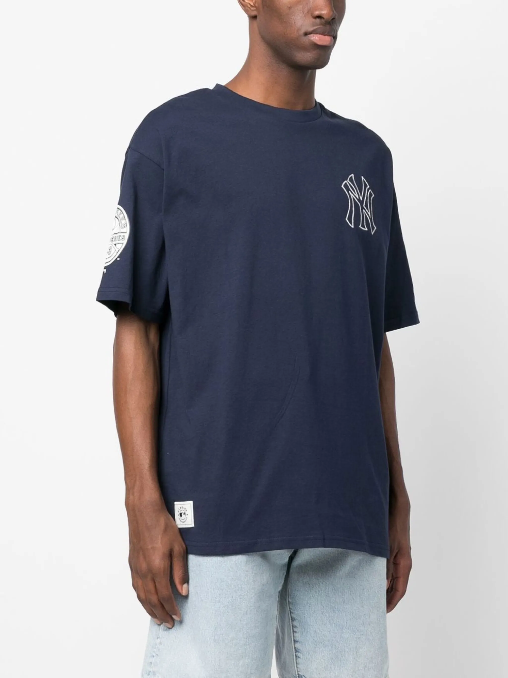 Темно-синий, хлопок, принт с логотипом на груди, нашивка с логотипом спереди, принт с логотипом сзади, круглый вырез, короткие рукава, принт с логотипом на рукаве и прямой подол.
