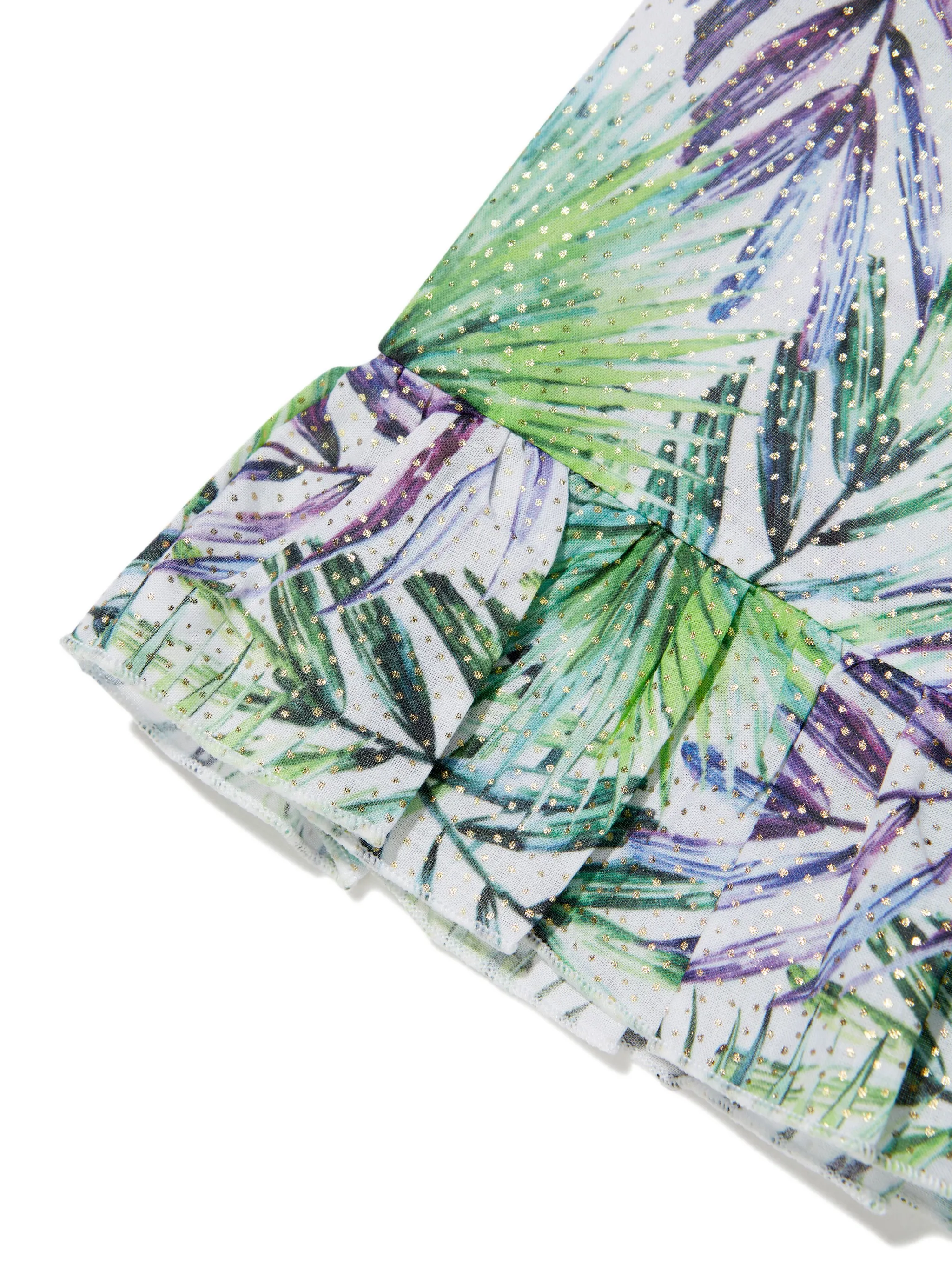Расцветка Grass Green, белый, хлопок, принт с изображением листьев, принт в горох, эффект металлик, вставки с оборками, застежка на узел и асимметричный подол.