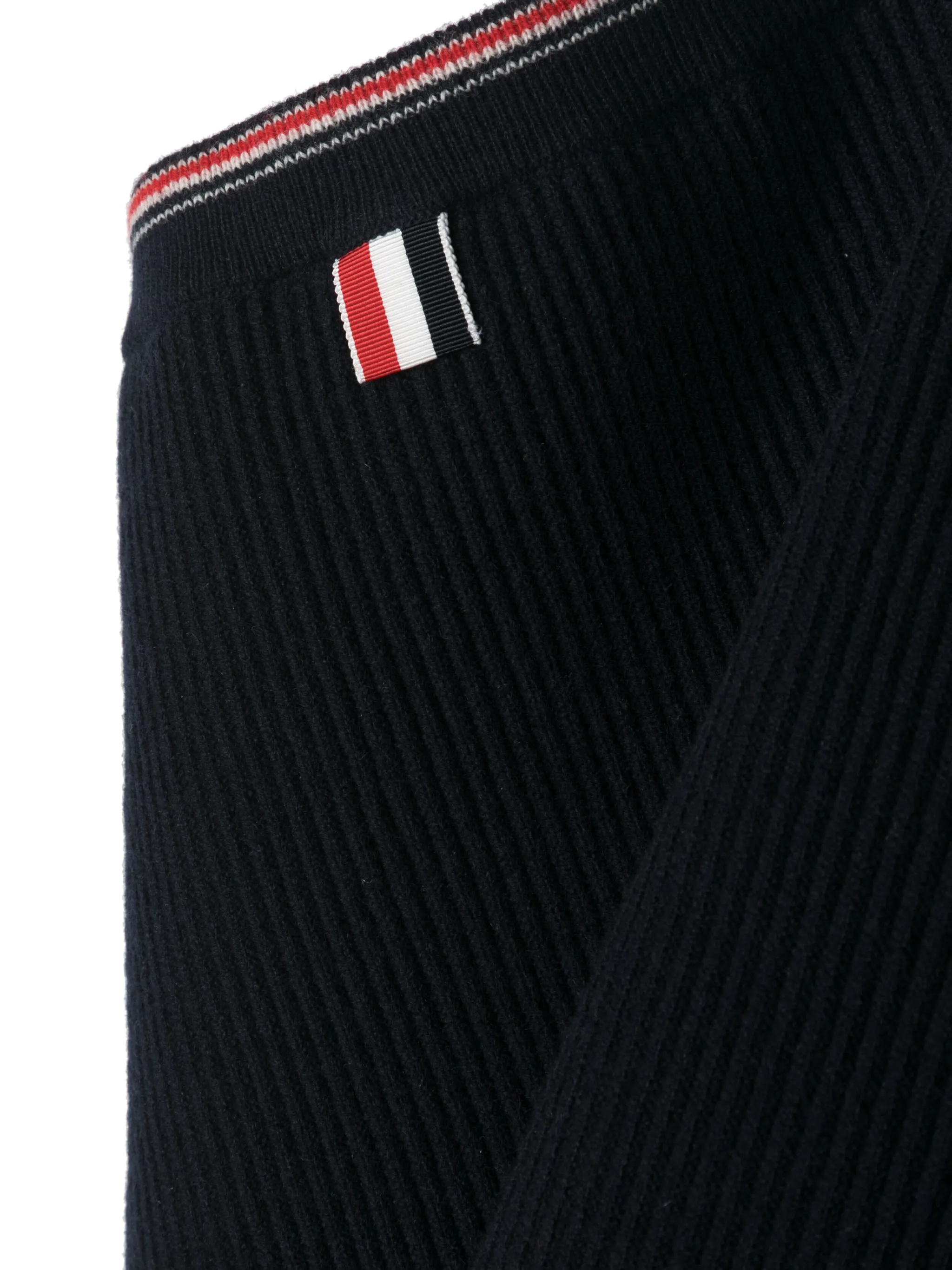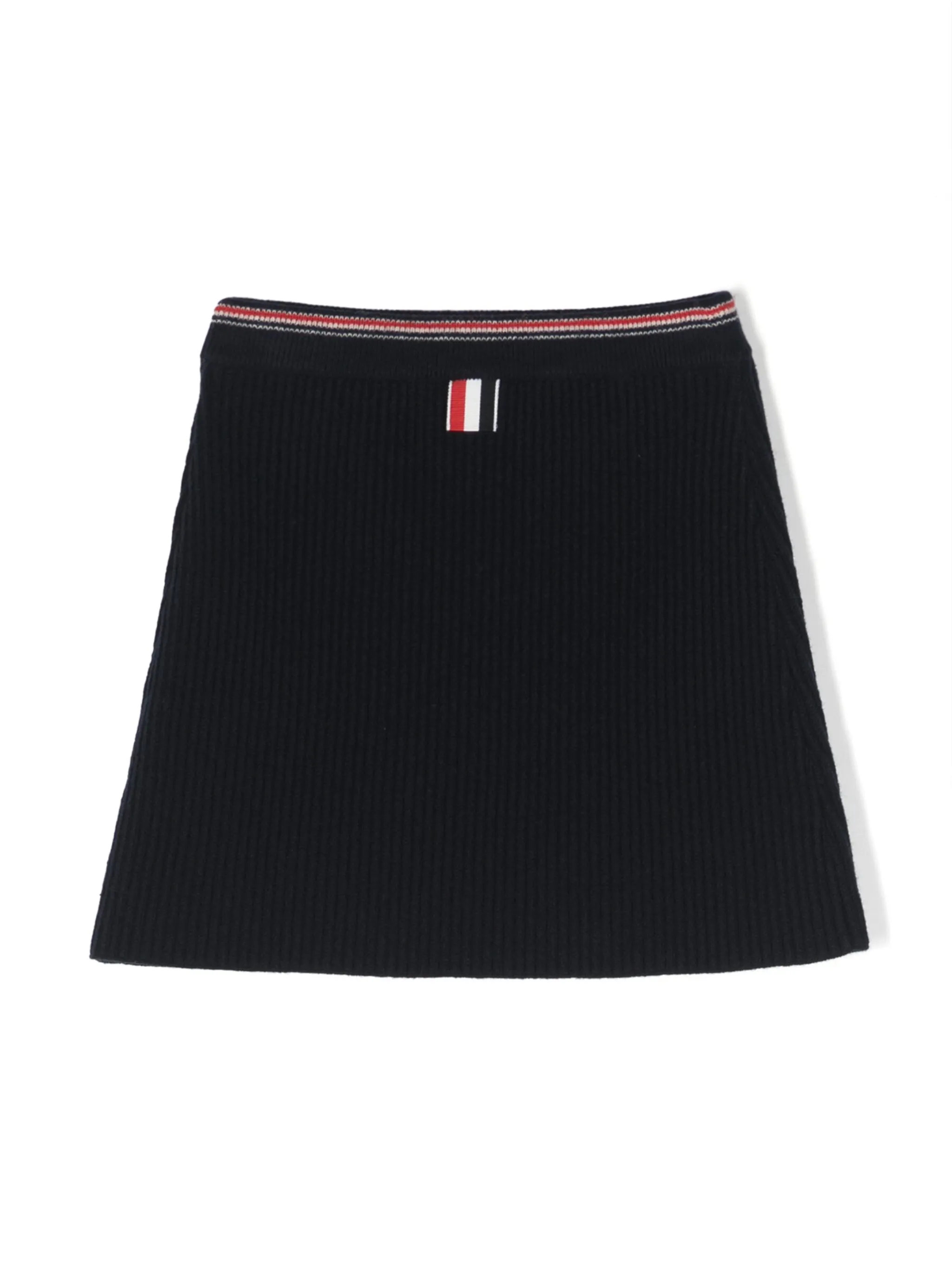 Темно-синий, смесь шерсти и кашемира, трикотаж в рубчик, края в полоску, нашивка с логотипом сзади, эластичный пояс, прямой подол и А-образный силуэт.