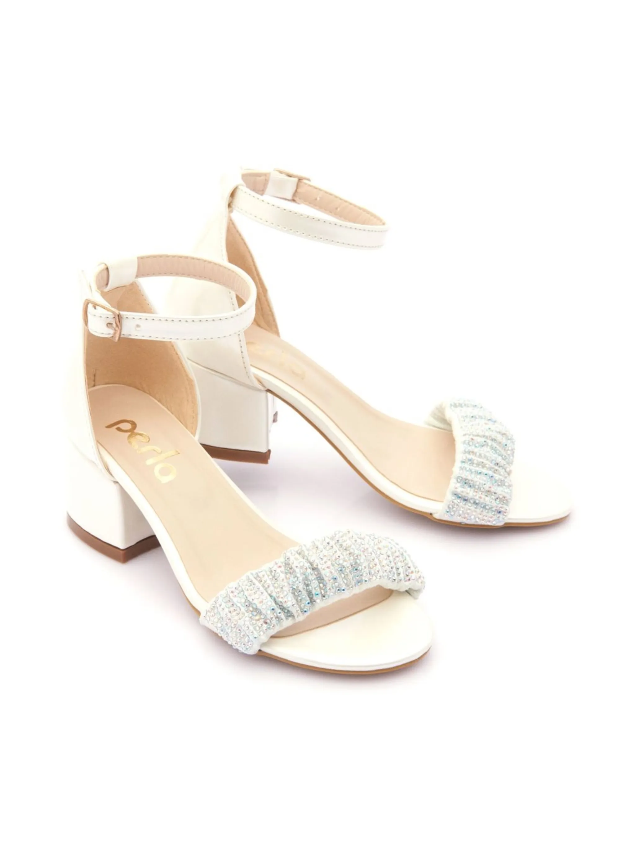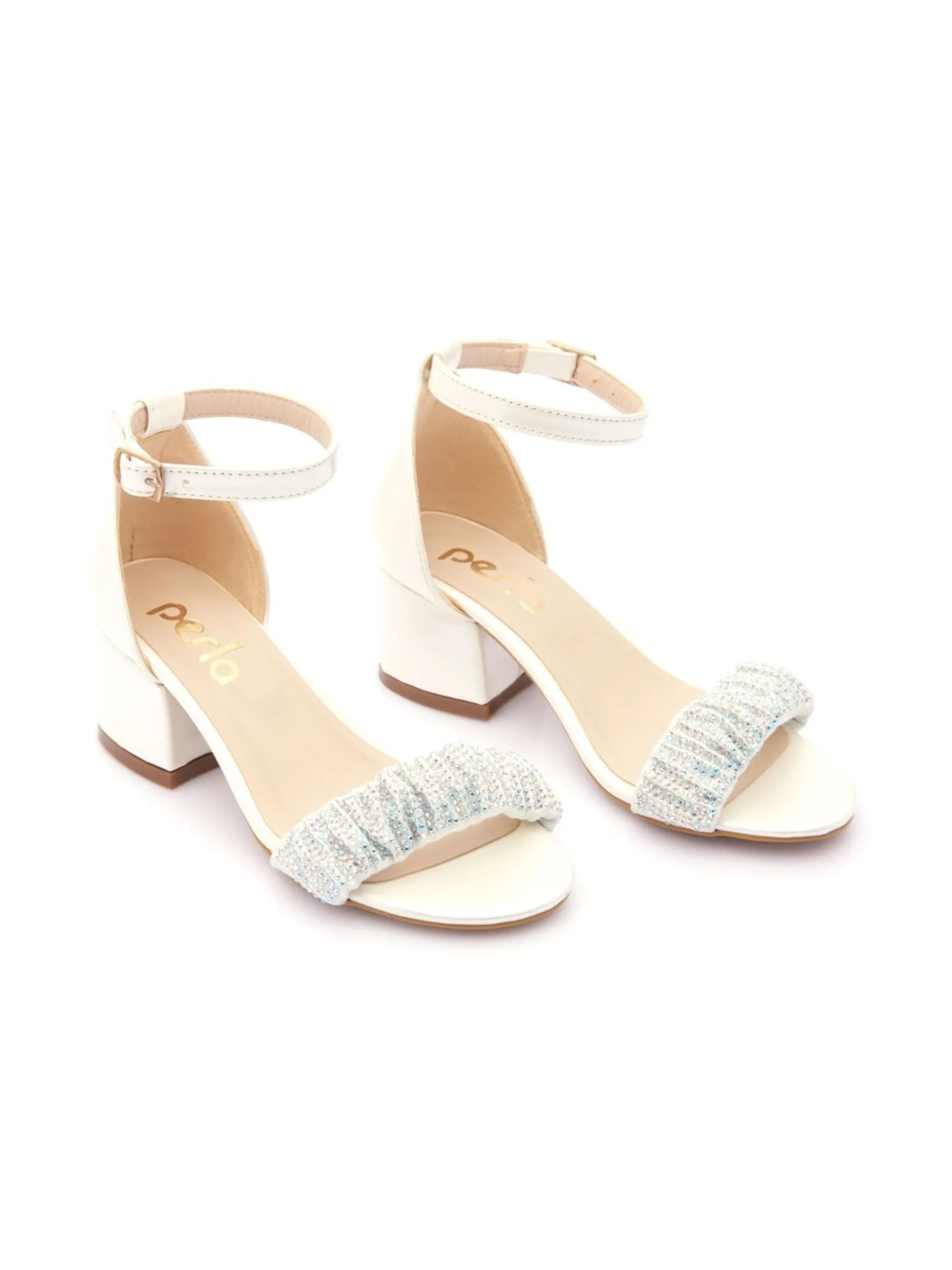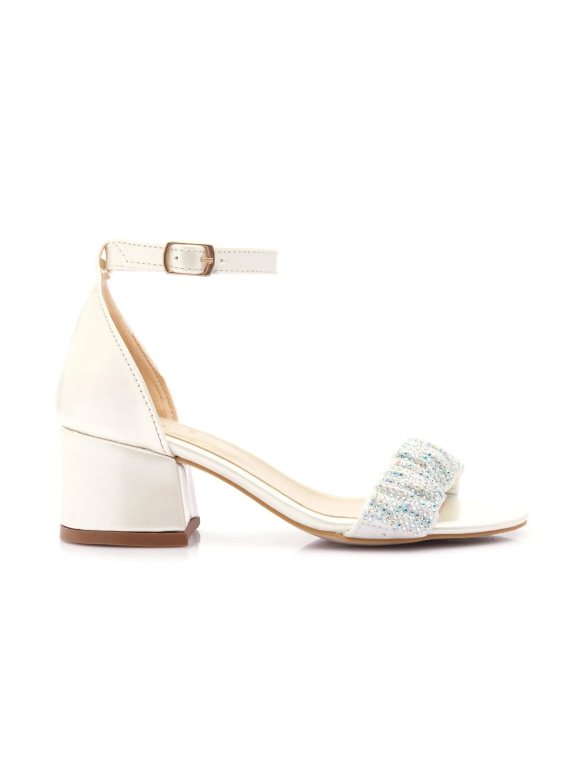 Кремовый, искусственная кожа, низкий блочный каблук, ремешок на щиколотке с пряжкой, украшения из горного хрусталя и открытый носок.