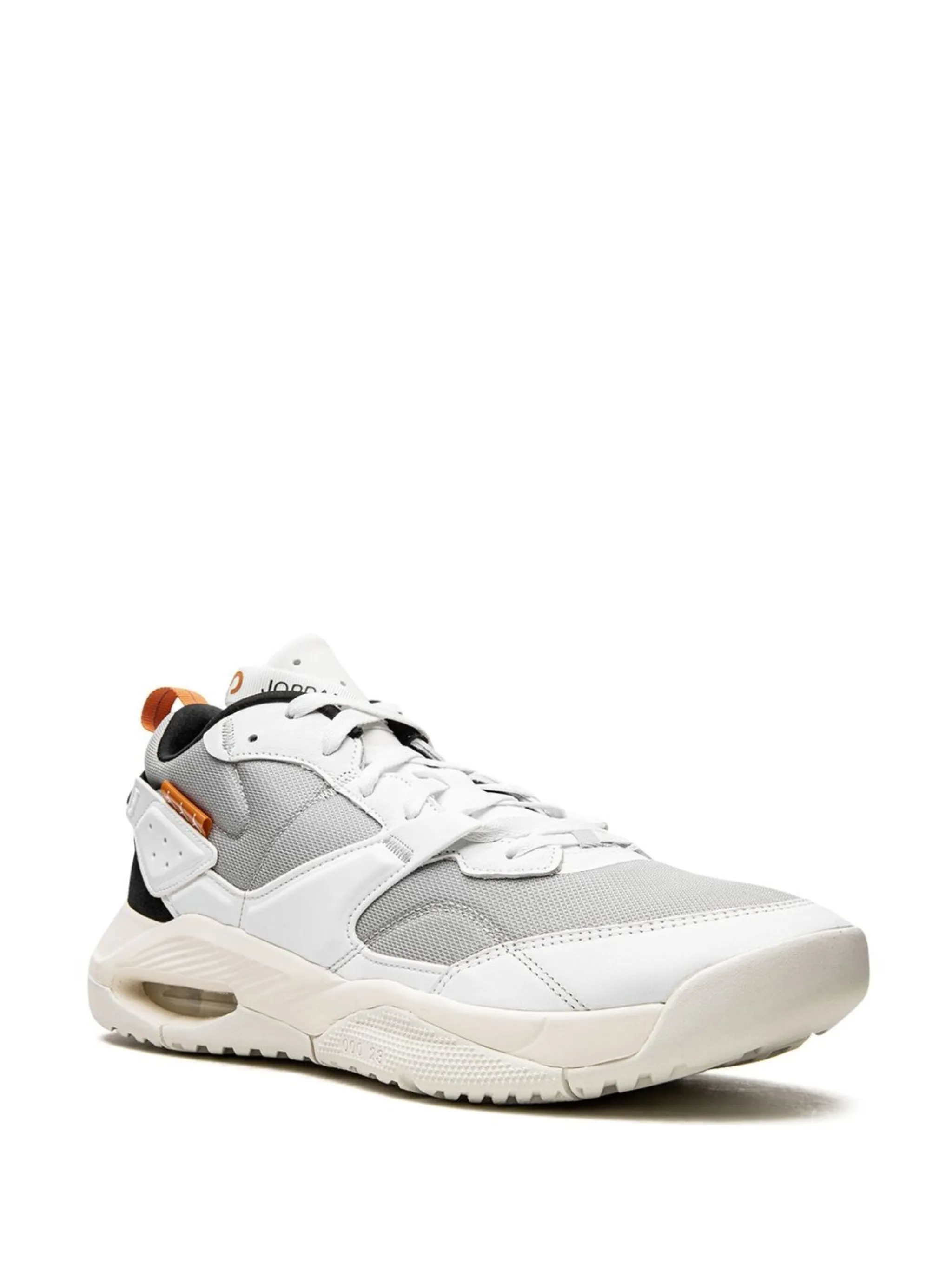 Белый, серый, оранжевый, сетчатые вставки, закругленный носок, шнуровка спереди, петля для подтягивания сзади, стелька с логотипом и резиновая подошва.
