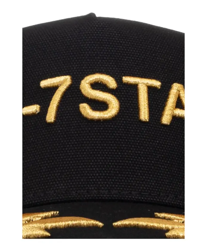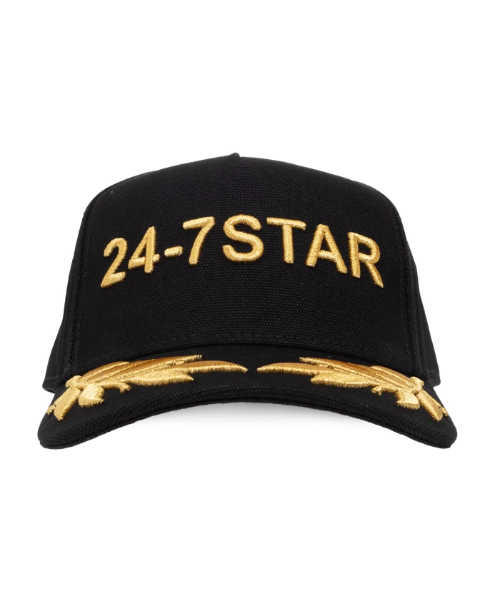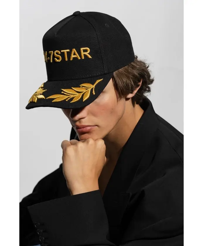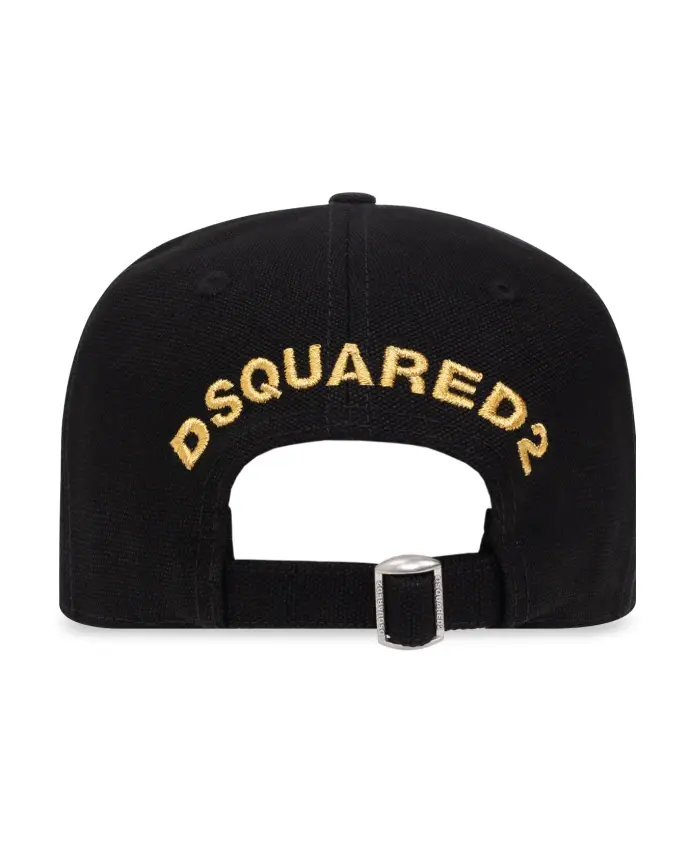 Черная бейсболка от Dsquared2. Изготовлена из хлопка, украшена вышитым узором золотистого цвета и имеет регулируемый ремешок с пряжкой сзади.