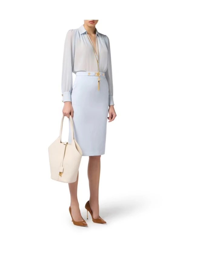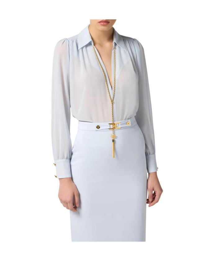 Блузка из жоржета от Elisabetta Franchi с цепочкой сочетает в себе облегающий, изысканный силуэт и съемную цепочку, что позволяет создавать разнообразные образы как для дневного, так и для вечернего выхода. Ключевые особенности: Синий | Звездный свет | Полиэстер | Съемная цепочка с логотипом и кисточкой | Ткань жоржет | V-образный вырез | Длинные рукава, слегка присборенные на плечах | Металлическая деталь в виде логотипа золотистого цвета | Размеры и посадка: Длина 67 см (размер IT 40) | Облегающий крой | Состав и уход: 100% полиэстер