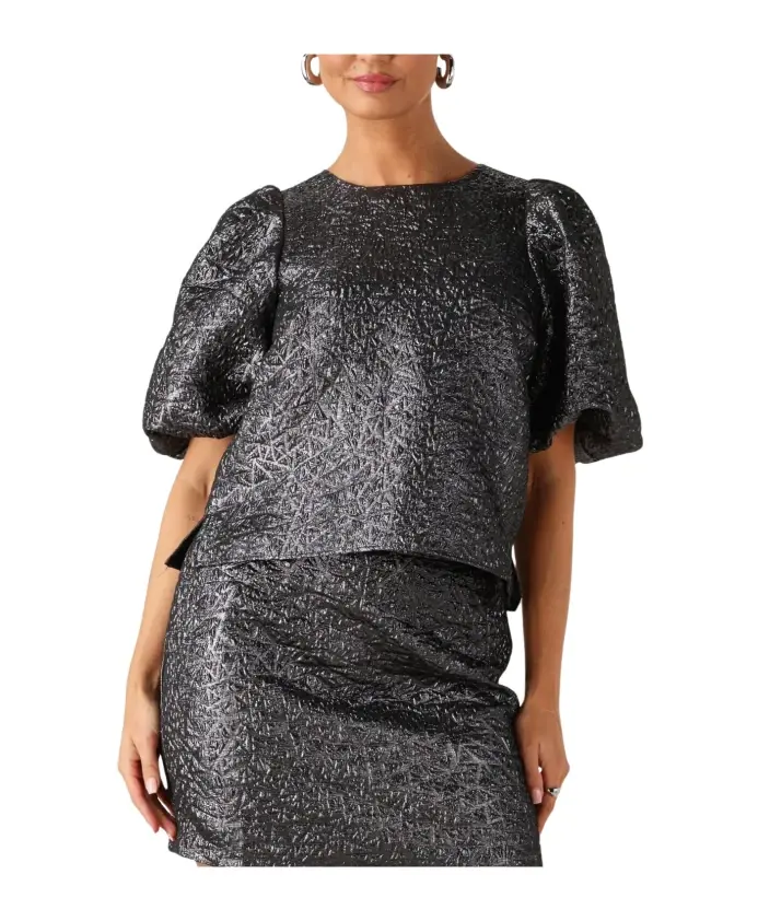 Блузка Notre-V NV-GERALDINA выполнена из полиэстера с металлизированной отделкой, которая переливается на свету, что делает ее идеальной для вечерних выходов и осенне-зимнего сезона. Сочетайте ее с шерстяной юбкой или кожаными брюками и ботинками для создания элегантного сезонного образа. Ключевые характеристики: Серый | Антрацитовый | Полиэстер | Металлизированная отделка | Круглый вырез | Короткие рукава | Короткая длина | Простой крой | Посадка: Свободная | Состав ткани и уход: 100% полиэстер | Ручная стирка