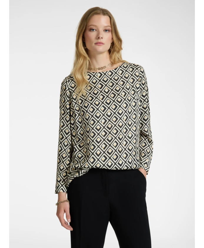 Описание товара: - Блузка прямого кроя с геометрическим принтом, вырезом-лодочкой и застежкой на пуговицы сзади - Манжеты рубашечного типа, кокетка на спине со складкой - Настоящая вещь, которая добавит свежести вашему образу благодаря яркому и универсальному принту. Состав и уход: - Основная ткань: 100% вискоза - Машинная стирка в очень щадящем режиме при 40°C; не сушить в сушильной машине; не отбеливать; сушить в горизонтальном положении; бережная химчистка; не гладить (макс. 110°C)