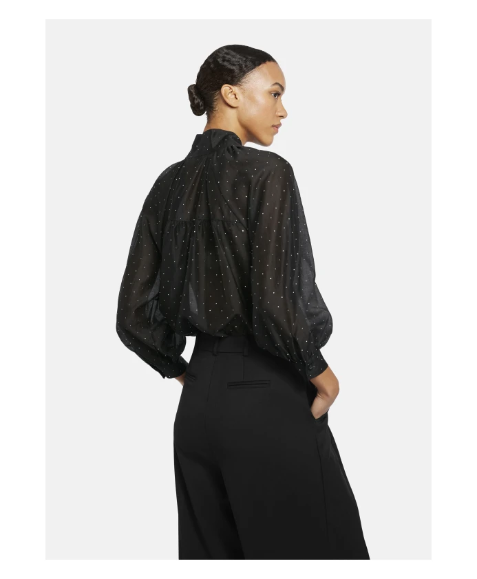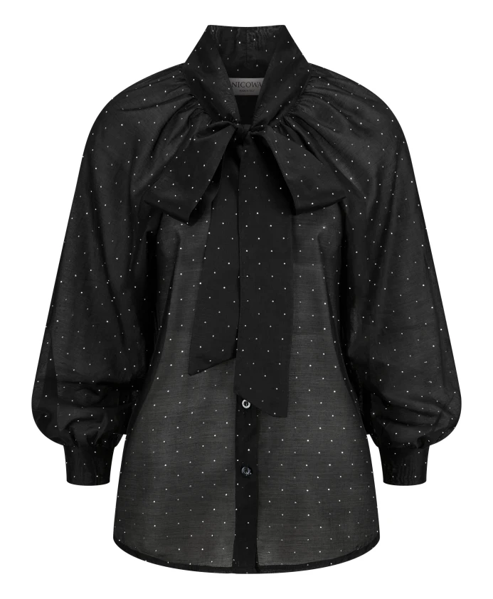 Блузка Nicowa FESTAWI впечатляет своим объемным кроем и полупрозрачной тканью лиоцелл. Бант на воротнике можно завязать отдельно, что добавляет образу женственности. Сверкающие аппликации из страз создают ненавязчивые акценты и элегантные детали. Изысканная вещь с оттенком прозрачности - современная и игривая.