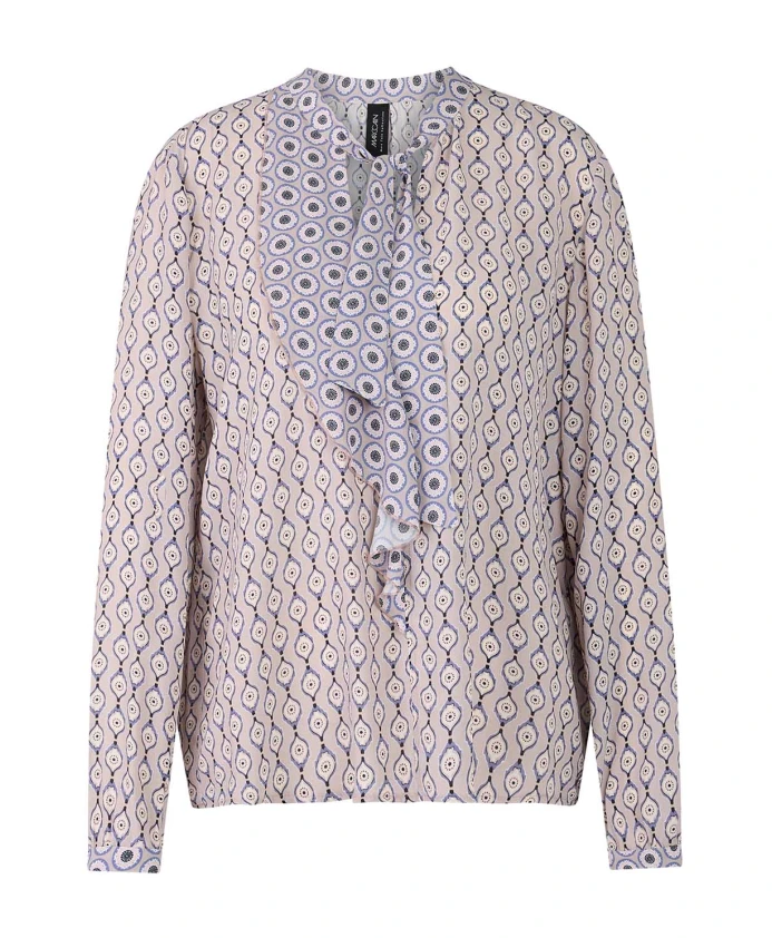 Легкая и струящаяся - эта блузка из мягкой вискозы впечатляет исключительным комфортом и стильным декоративным принтом. Особое внимание привлекает игривое сочетание завязки и оборки спереди. Длинные рукава заканчиваются узкими манжетами и элегантно застегиваются на блестящую лакированную пуговицу.