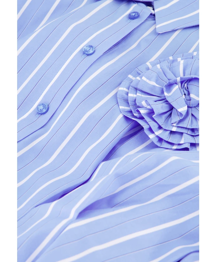 Эта темно-синяя джинсовая блузка изготовлена из хлопка и имеет приталенный крой, создающий привлекательный силуэт. Съемная брошь в виде цветка украшает грудь, позволяя менять образ в зависимости от настроения. Сочетайте блузку с любимыми джинсами для стильного и элегантного наряда.