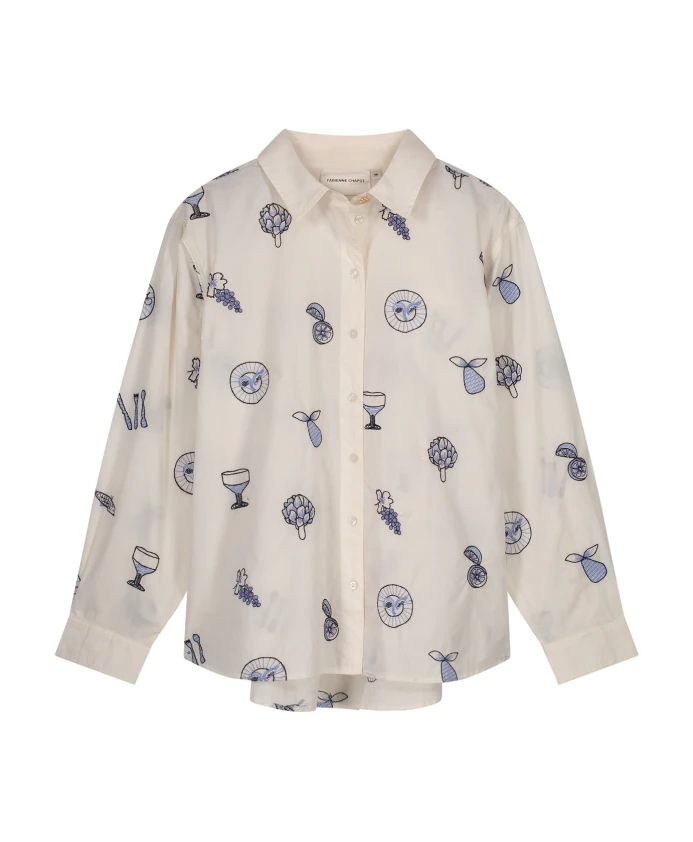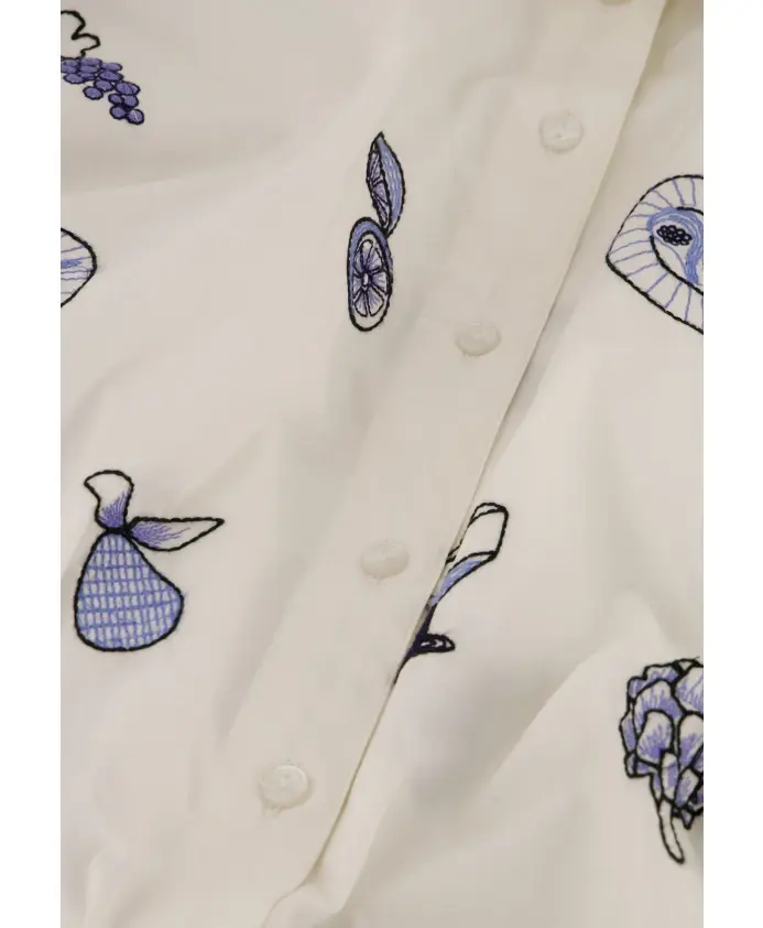 Эта белая блузка украшена синей вышивкой с изображением бокалов и тарелок, напоминающей летнюю сервировку стола. Настоящая изюминка гардероба, изготовленная из 100% органического хлопка. Сочетайте ее с любимыми джинсами для создания непринужденного женственного образа.