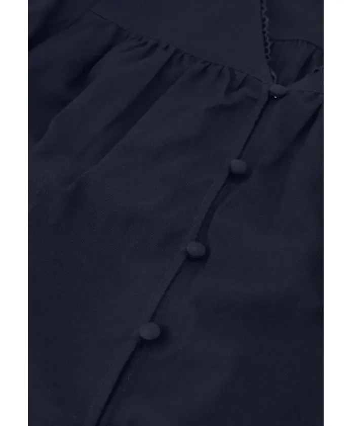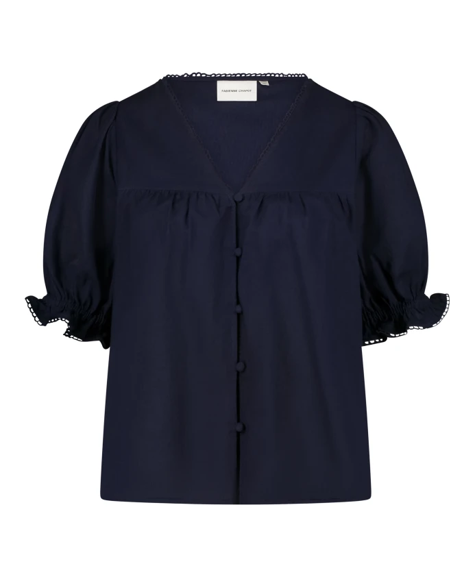 Эта темно-синяя блузка с короткими рукавами-фонариками, изящными оборками и V-образным вырезом. Она имеет стандартный крой и изготовлена из роскошной хлопковой смеси, мягкой и приятной на ощупь. Игривая и элегантная - идеально подходит для повседневной носки.