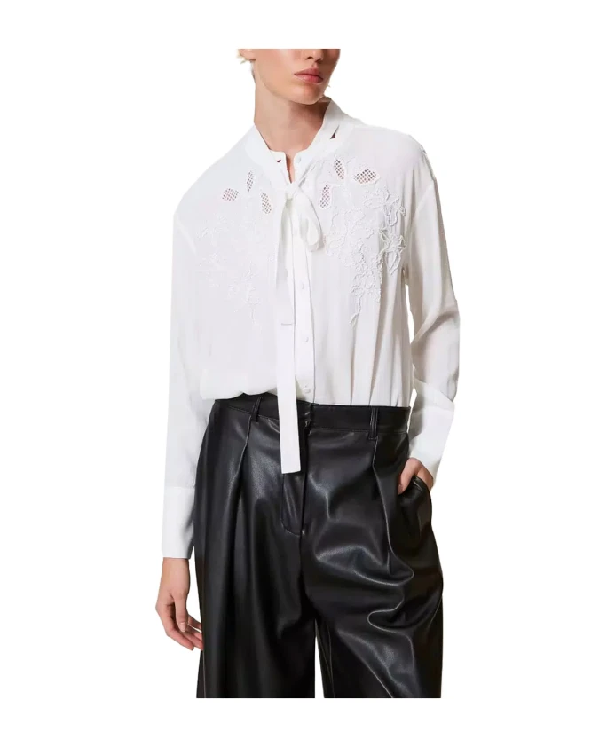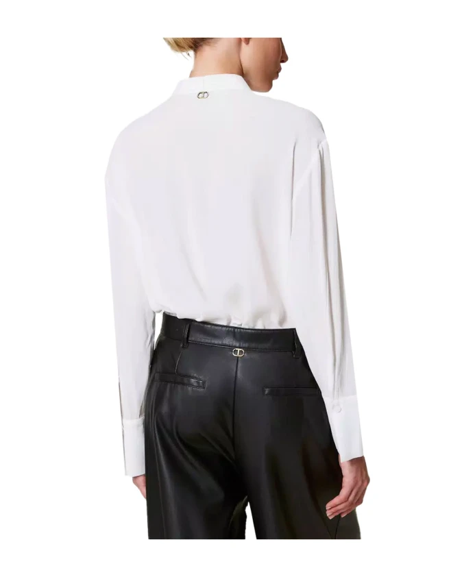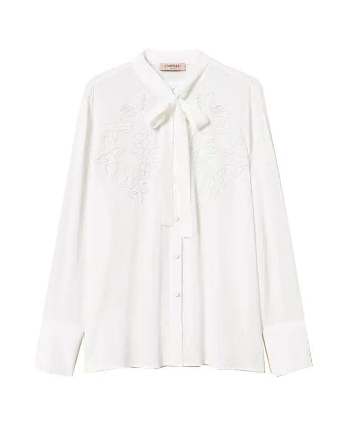 Подчеркните свою элегантность с помощью этой однотонной рубашки от Twinset. Вышивка на передней части гарантирует стильный и сдержанный дизайн. Длинные рукава и воротник-стойка создают изысканный образ, а пуговицы и прямой низ добавляют неповторимости.