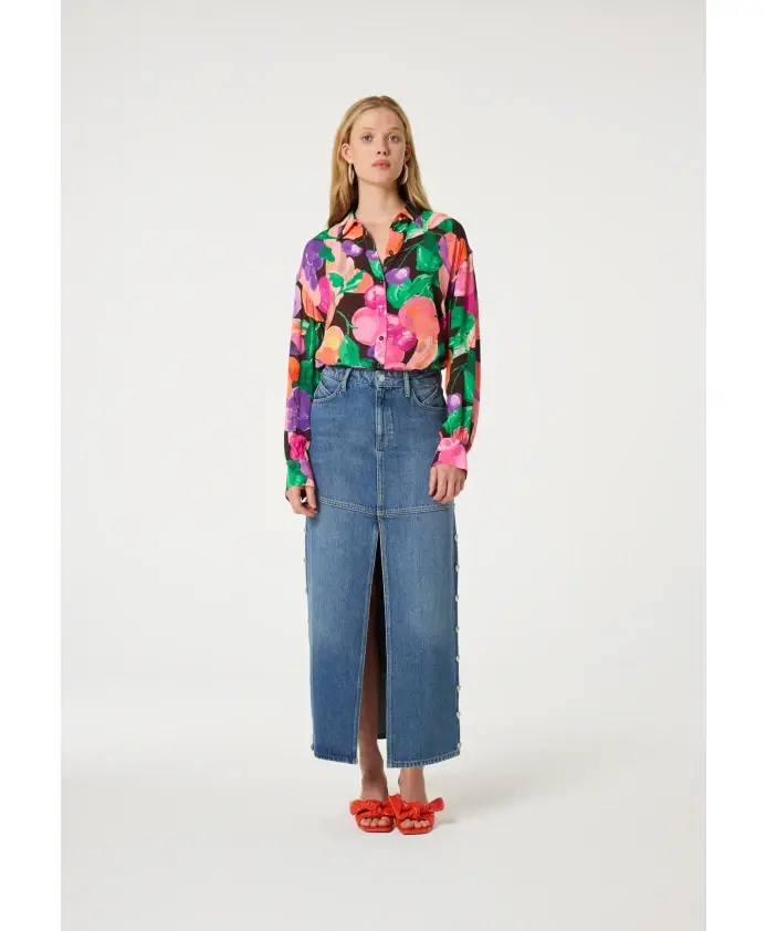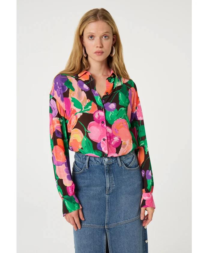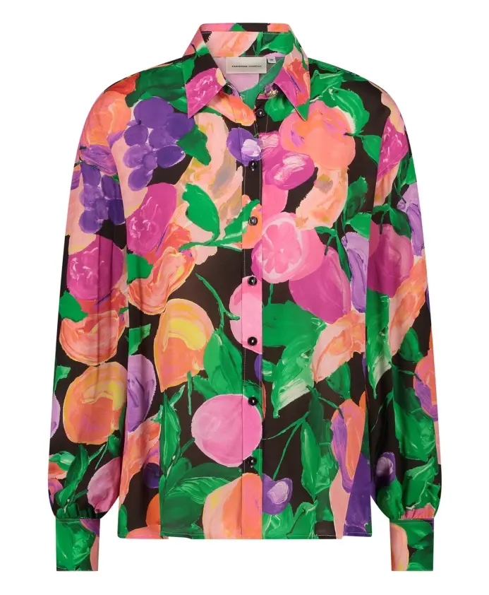 Эта женская блузка имеет классический воротник, длинные рукава, пуговицы и принт в виде свежих фруктов. Она изготовлена из 100% вискозы. Дополните образ этой блузкой с нашей джинсовой юбкой Maya Denim.