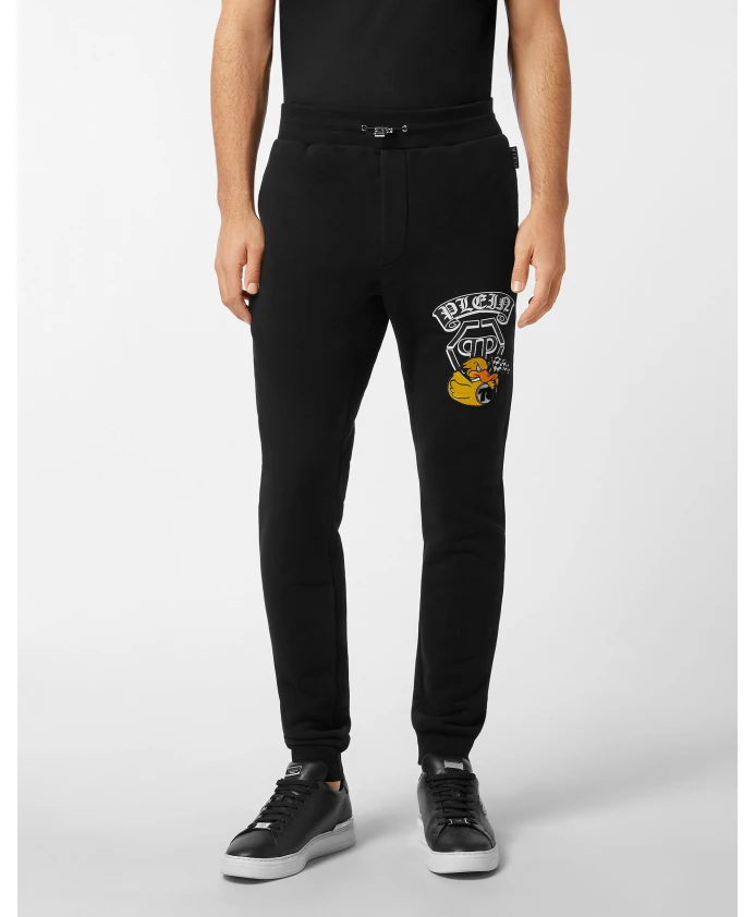 Спортивные брюки Philipp Plein DUCK из хлопкового флиса с привлекательным принтом и фирменными нашивками создают эффектный повседневный образ. Эти брюки сочетают в себе простую функциональность и декоративные элементы для повседневной носки. Ключевые особенности: Черный цвет | Хлопковый флис | Боковые карманы | Ребристый пояс со шнурком | Ребристые манжеты | Узорчатый принт на левой штанине | Вышитая нашивка на левой штанине | Логотип | Уникальные декоративные детали