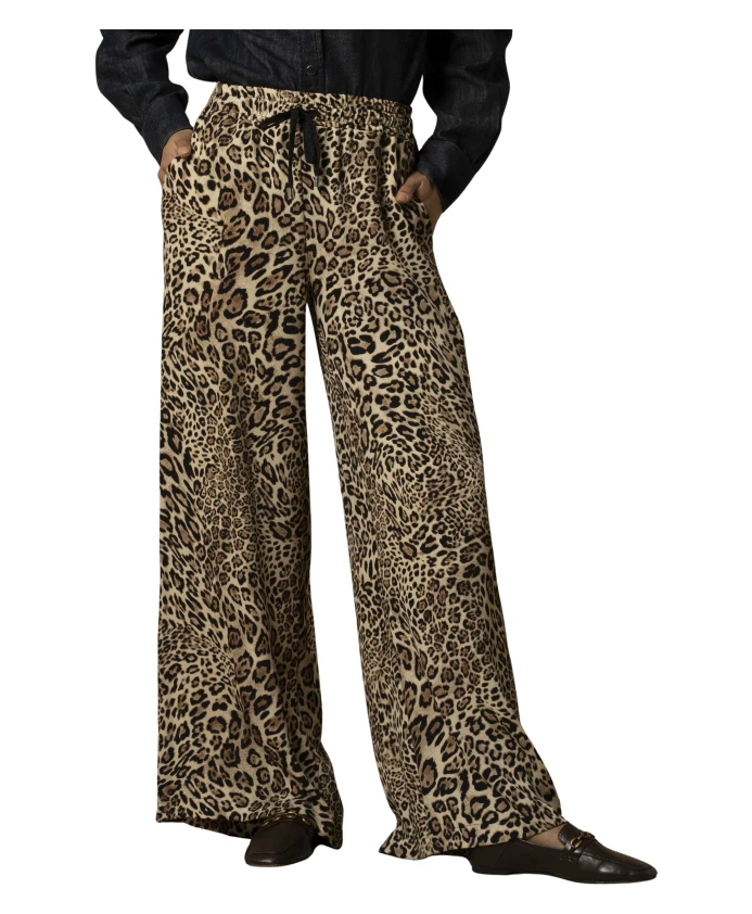 Стильные повседневные спортивные брюки с леопардовым принтом, эластичным поясом на шнурке, боковыми карманами, расклешенными штанинами и двойной прострочкой по низу. Рост модели 175 см, размер S/42.