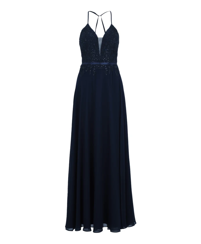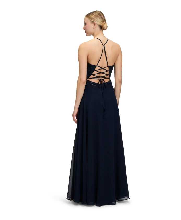 Это вечернее платье сделает вас просто потрясающей! Изысканная вышивка придает праздничному платью особую элегантность, а красивый разрез добавляет нотку утонченности. Открытая спина с нежной шнуровкой также привлекает внимание и дополняет элегантный дизайн. V-образный вырез выгодно подчеркивает декольте и делает платье идеальным выбором для особых случаев. В этом платье вы гарантированно привлечете всеобщее внимание!