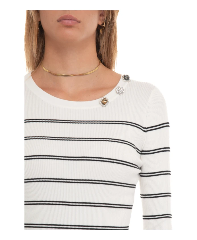 Пуловер LIU JO MF3001 - это полосатый вязаный свитер с круглым вырезом, декоративными аппликациями и логотипом, созданный для повседневного многослойного ношения. Ткань с высоким содержанием вискозы обеспечивает мягкую драпировку и комфорт при ношении. Ключевые особенности: Разноцветный | Белый | Черный | Вискоза | Круглый вырез | Полосатый узор | Декоративная аппликация | Логотип | Размер и посадка: Стандартный крой | Состав и уход: 62% вискоза | 38% полиэстер