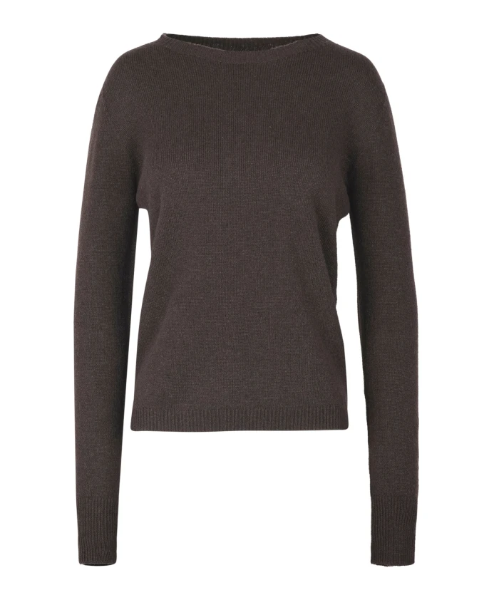 Кашемировый свитер Jucca: Классический вязаный свитер с круглым вырезом, созданный для изысканных многослойных образов и повседневной носки, обеспечивающий мягкое тепло и минималистичный силуэт. Ключевые особенности: Коричневый | Шоколадный | Кашемир | Круглый вырез | Длинные рукава реглан | Ребристый воротник, манжеты и нижний край | Размеры и посадка: Стандартный крой | Рост модели 175 см, размер S | Состав и уход: 100% кашемир