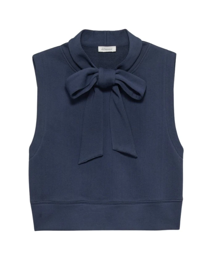 Кардиган без рукавов с игривым бантом на воротнике и круглым вырезом. Модель Alice имеет прямой крой и укороченный низ, что делает его идеальным для сочетания со спортивными штанами Moonflower. Изготовлен из 100% органического хлопка - мягкого, дышащего и произведенного с соблюдением принципов ответственного производства. Повседневная одежда со стильным акцентом.