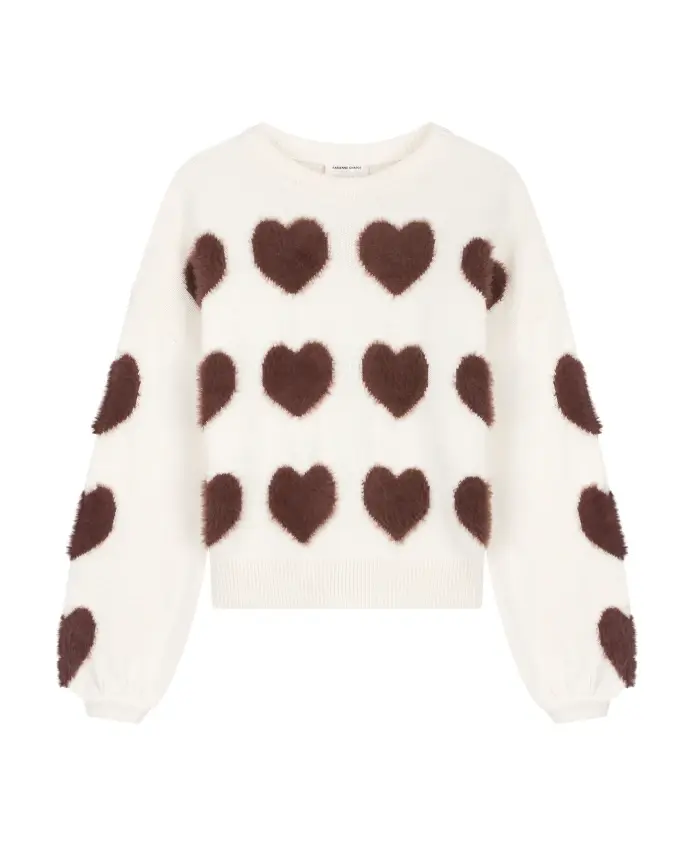 Этот мягкий белый свитер, украшенный коричневыми сердечками, добавит вашему образу игривости и уюта. Изготовленный из пушистой смеси материалов, он невероятно мягкий и комфортный на ощупь. Сочетайте его с брюками свободного кроя для создания непринужденного, повседневного образа или наденьте поверх юбки для игривого, привлекательного образа.