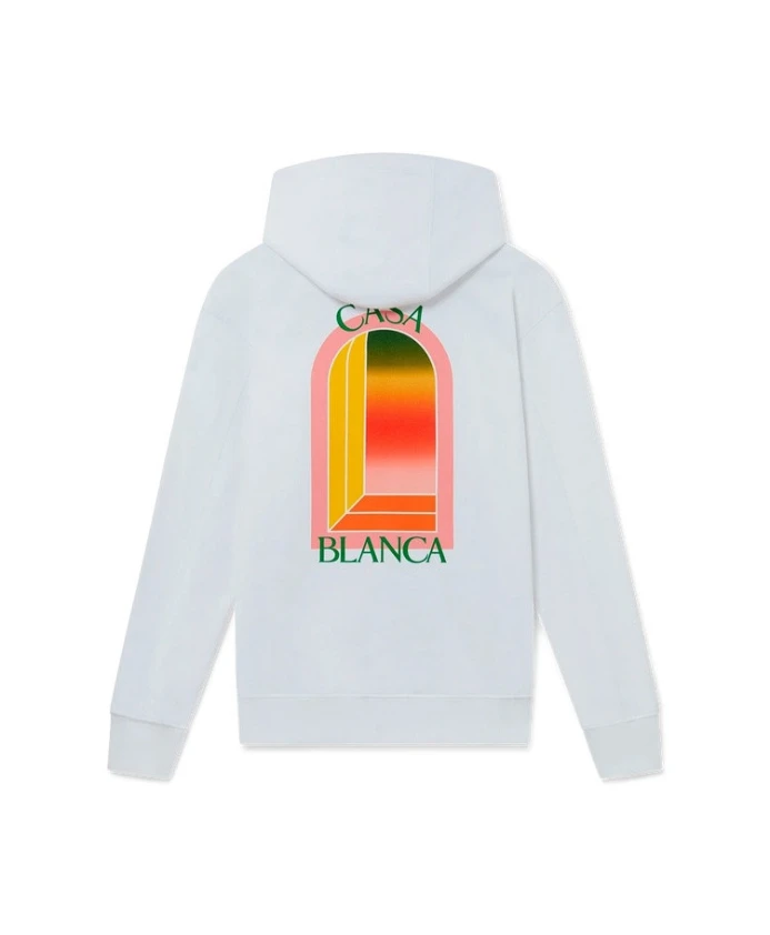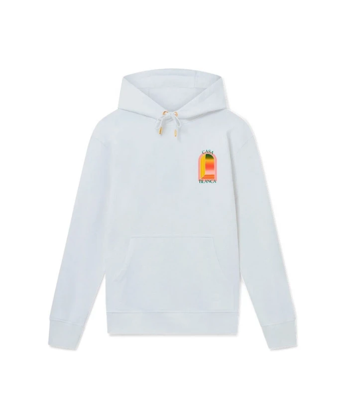 Подчеркните свой уличный стиль с помощью этой белой худи Casablanca 'Gradient L'Arche' с принтом на груди и спине. Изготовленная из 100% хлопка, эта классическая худи имеет регулируемый шнурок с золотистыми наконечниками, ребристые манжеты и нижний край, а также свободный крой.