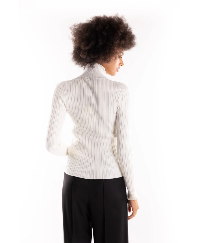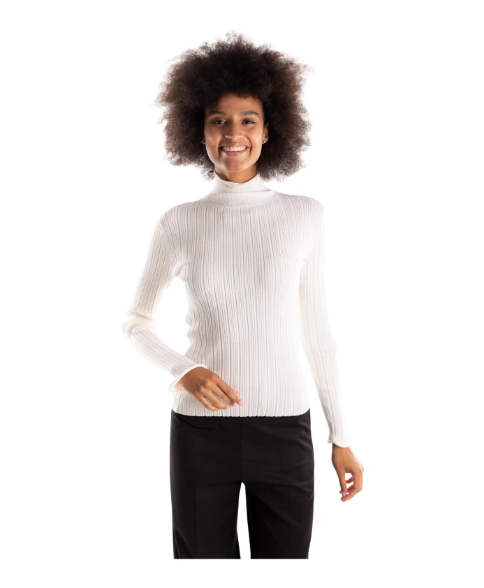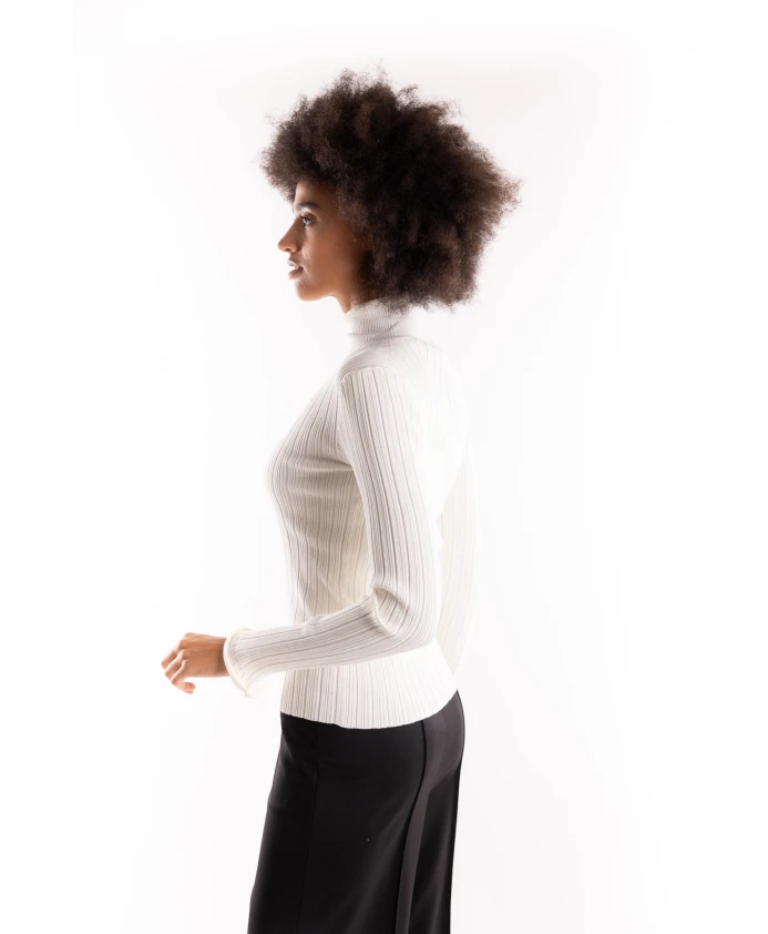 Вязаный топ Marella с круглым вырезом, кремового цвета. Приталенный крой, ребристая текстура. Высокий воротник и длинные рукава с оборками на манжетах. Состав: 62% вискоза и 38% полиэстер. Рост модели 1,75 м, размер S.