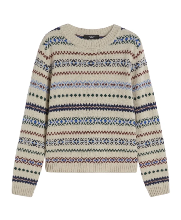 Женская трикотажная вещь Weekend Max Mara с круглым вырезом и жаккардовым узором контрастных цветов. Изготовлена из смеси альпаки и шерсти, имеет стандартный крой, среднюю длину, длинные рукава и ребристую окантовку.