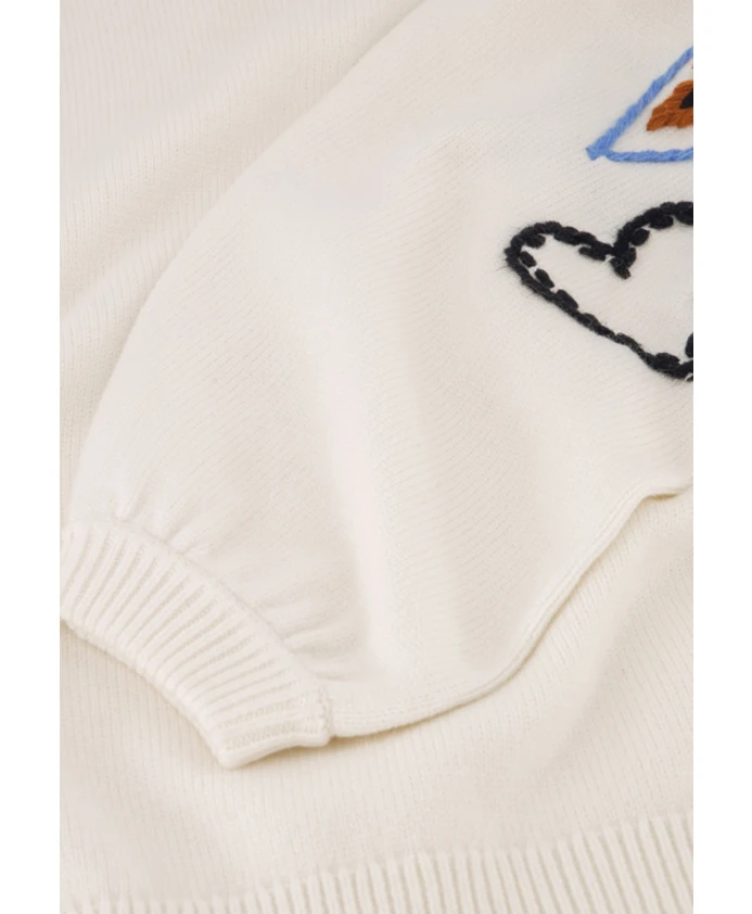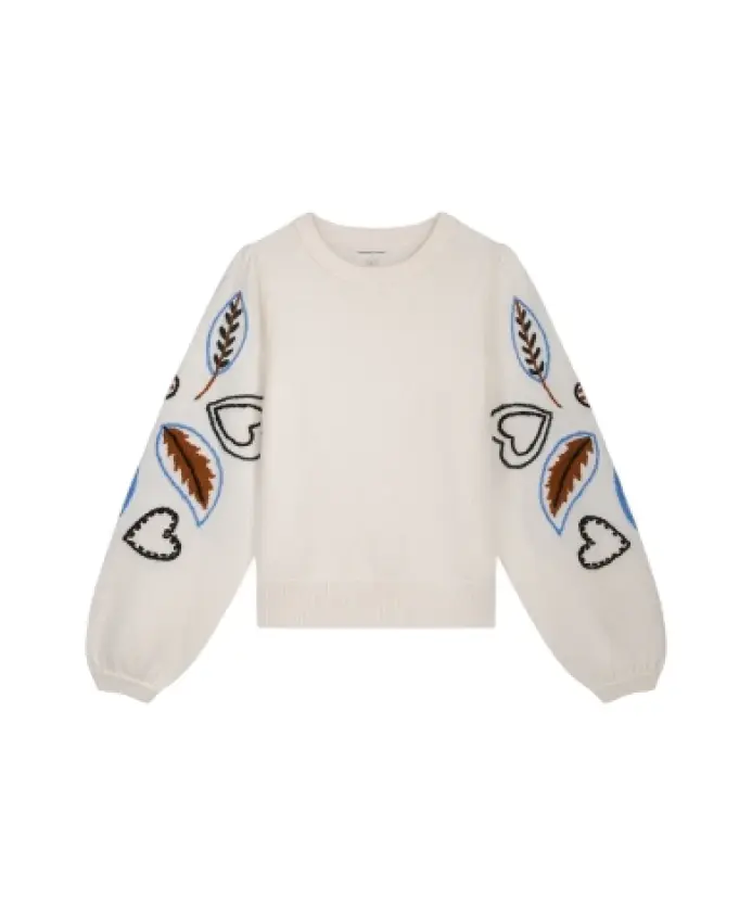 Этот белый свитер имеет круглый вырез и красочную вышивку вдоль рукавов. Изготовлен из высококачественной смесовой ткани. Сочетайте его с нашими широкими джинсами «Бонни» для создания стильного повседневного образа.