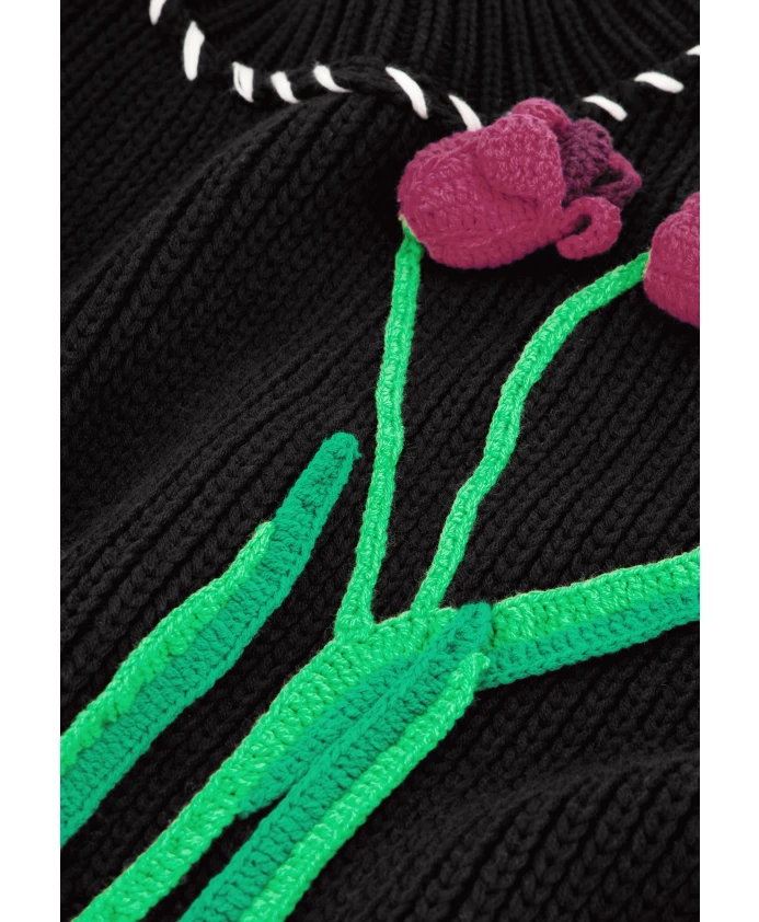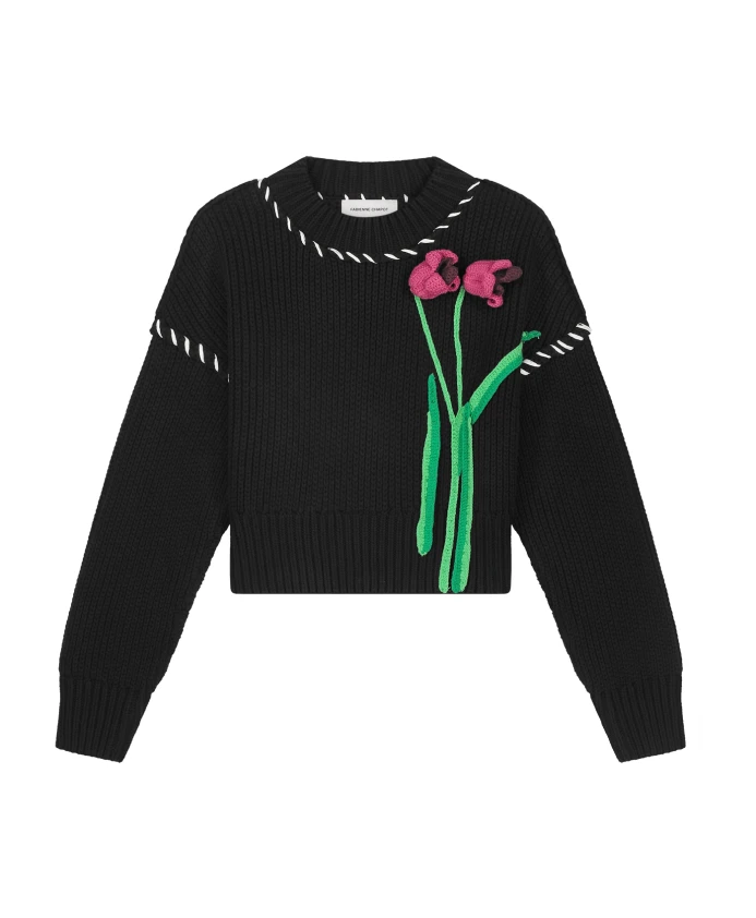 Этот черный свитер с вышитым тюльпаном на передней части добавит уюта любому образу. Сочетайте его с брюками свободного кроя или наденьте поверх платья для непринужденного и стильного осеннего дня.