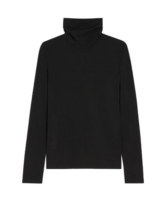 Подчеркните свой стиль с помощью этого черного женского свитера с высоким воротником. Изготовлен из эластичной вискозной ткани с длинными рукавами.