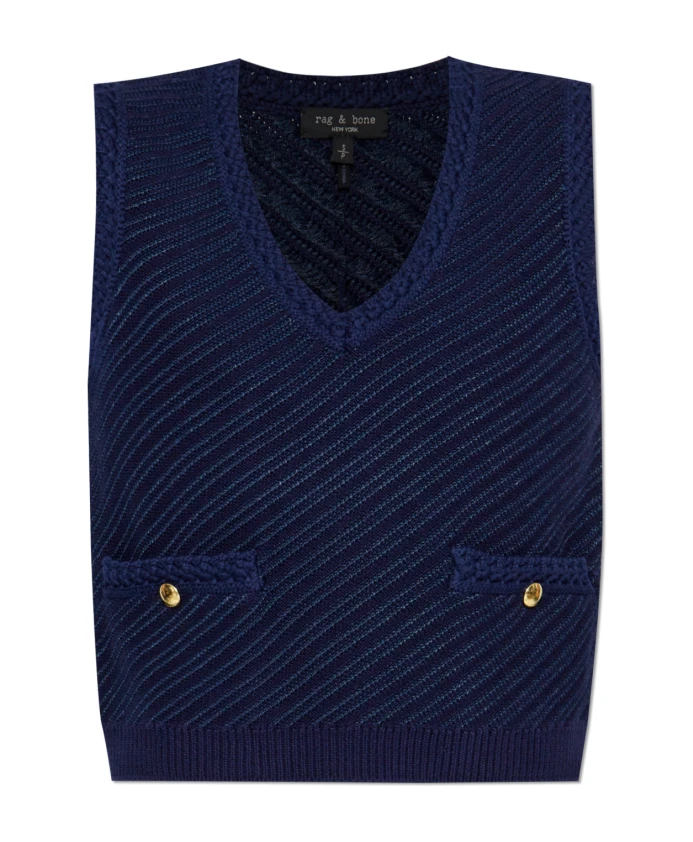 Представляем жилет с карманами - уникальный шедевр от известного бренда RAG & BONE. Эта единственная в своем роде вещь сочетает в себе классический дизайн и современную роскошь. Жилет отличается элегантным кроем с V-образным вырезом, а текстура ткани, созданная диагональными линиями вязки, добавляет ему неповторимую глубину. Изготовленный из исключительно прочного, но мягкого трикотажа, жилет сочетает в себе лучшие качества хлопка, вискозы, нейлона и спандекса. Глубокий темно-синий цвет излучает ауру элегантности, а два передних кармана с золотыми пуговицами добавляют изысканности и практичности. Простой, но утонченный дизайн без видимых логотипов удовлетворит любителей сдержанного стиля. Почему стоит купить этот товар? * Классический крой, который никогда не выходит из моды. * Высококачественные материалы обеспечивают долговечность и комфорт. * Элегантные детали в виде золотых пуговиц. * Универсальность, подходит для многих стилей. Параметры модели: Рост: 177 см, Обхват груди: 83 см, Обхват талии: 61 см, Обхват бедер: 89 см. Модель носит размер: S.