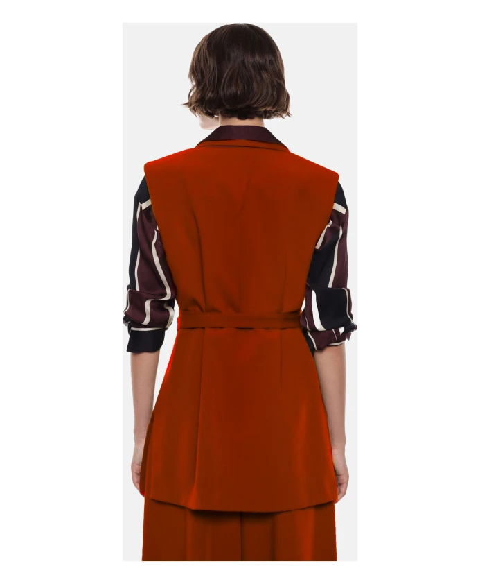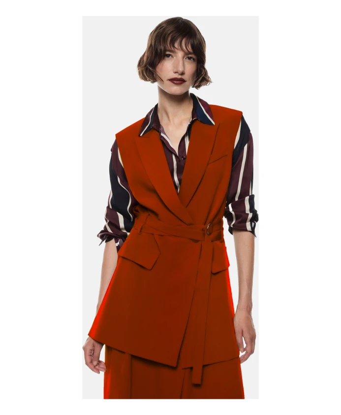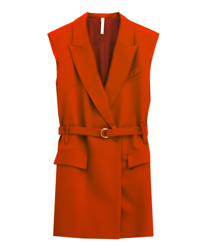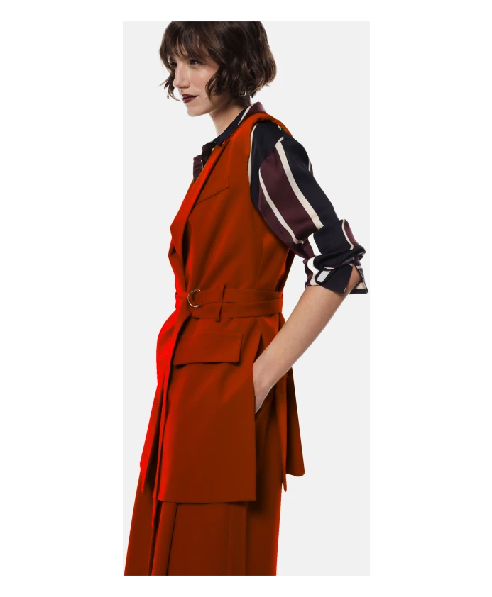 Жилет Imperial - это длинный, приталенный жилет из саржевой ткани, созданный для придания формы и подчеркивания талии при ношении поверх рубашек или платьев. Ключевые особенности: Красный | Цвет: карминио | Саржа | Легкая эластичность | Съемный пояс с пряжкой и двойными петлями | Застежка на пуговицы спереди | Накладные карманы | Боковые разрезы | Полностью на подкладке | Лацканы с вырезом | Без рукавов | Удлиненный силуэт | Приталенный, структурированный дизайн | Размеры и посадка: Прямой крой | Структурированный силуэт | Состав и уход: 72% полиэстер, 23% вискоза, 5% эластан | Машинная стирка.
