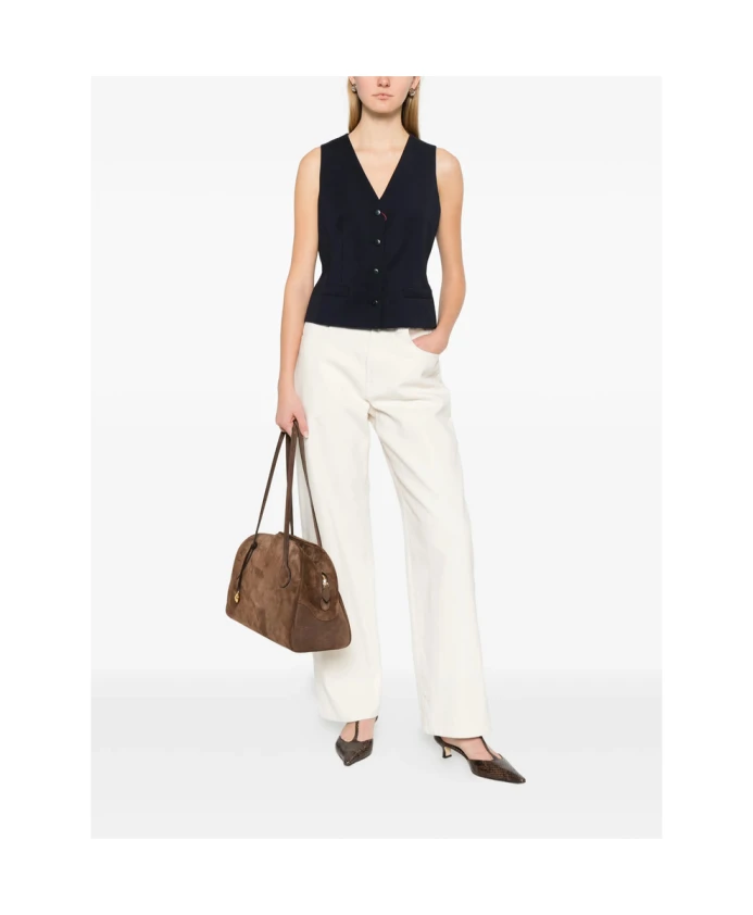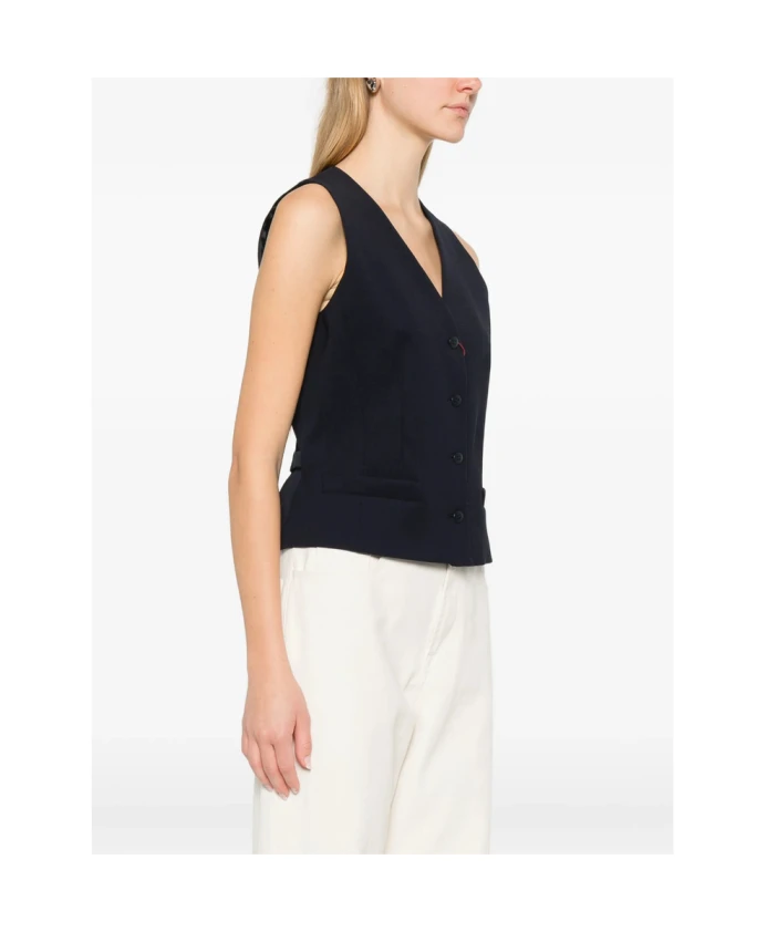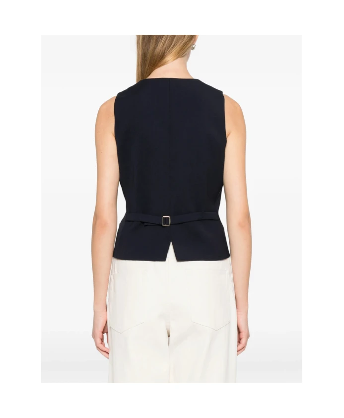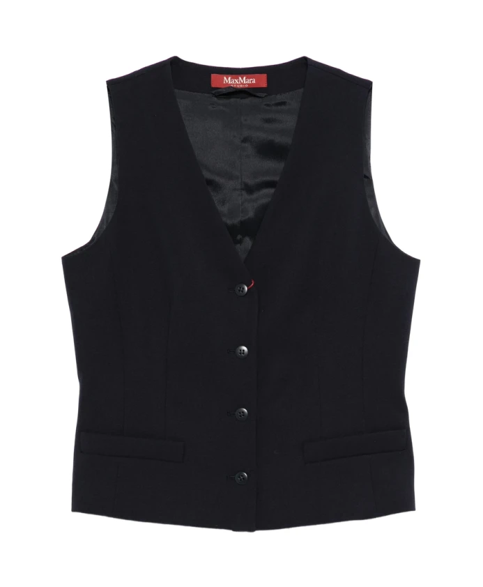 Жилет Max Mara Studio - это приталенный, безрукавный жилет с V-образным вырезом и застежкой на пуговицы спереди. Идеально подходит для офисных или повседневных образов, он добавляет структурированности и элегантности, если носить его поверх рубашек или трикотажа. Ключевые особенности: Синий | Черный | Застежка на пуговицы спереди | V-образный вырез | Без рукавов | Силуэт жилета