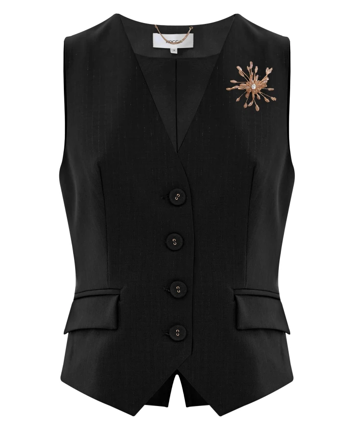 Жилет Kocca без рукавов из капсульной коллекции Pure Verve. Элегантный и универсальный жилет с пуговицами в тон и изящной брошью для создания утонченного образа. Ключевые особенности: Черный | Черный | Два передних кармана | Силуэт без рукавов | Пуговицы в тон | Изящная брошь в верхнем левом углу | Два передних кармана | Размеры и посадка: Рост модели 175 см, размер S/42