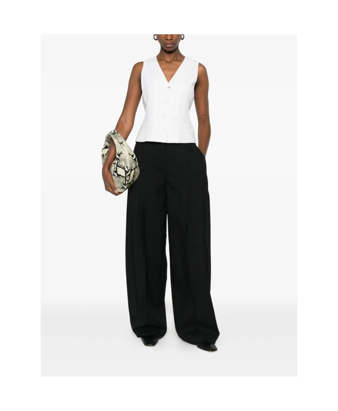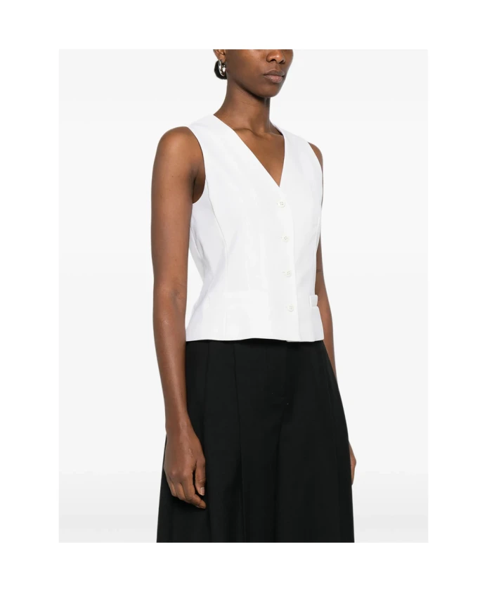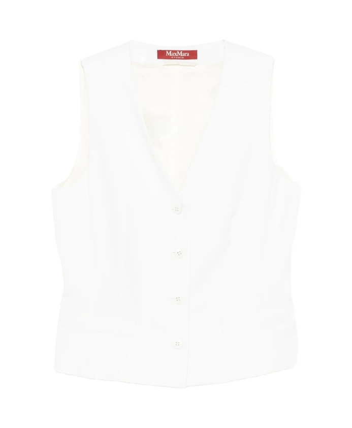 Жилет Max Mara Studio - кремовый, без рукавов, с V-образным вырезом, застежкой на пуговицы и прорезными карманами. Изысканный элемент многослойного образа для элегантных и повседневных нарядов. Ключевые особенности: Кремовый | Белый | Нейтральные цвета | Застежка на пуговицы | V-образный вырез | Без рукавов | Прорезные карманы