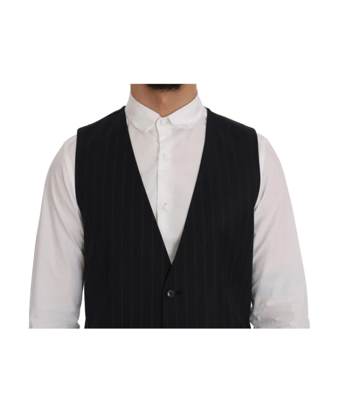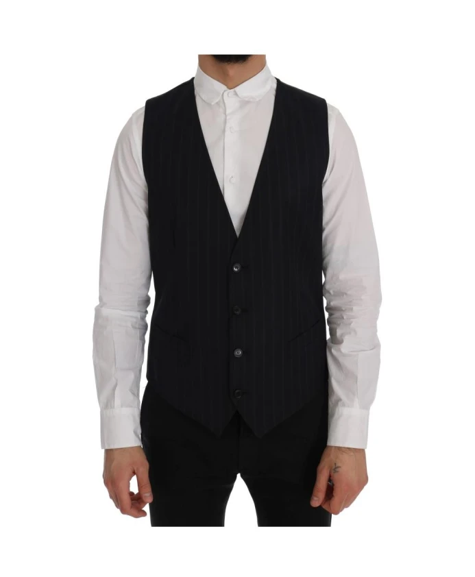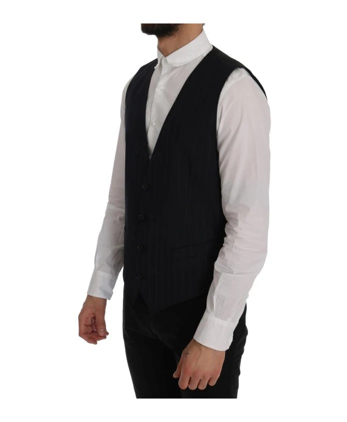 Подчеркните свой элегантный образ этим потрясающим жилетом Dolce & Gabbana Staff, на 100% оригинальным. Изготовленный из 97% шерсти и 3% эластана, этот синий полосатый жилет имеет застежку на все пуговицы, регулируемый пояс на спине и логотип. Идеально подходит для современного джентльмена.