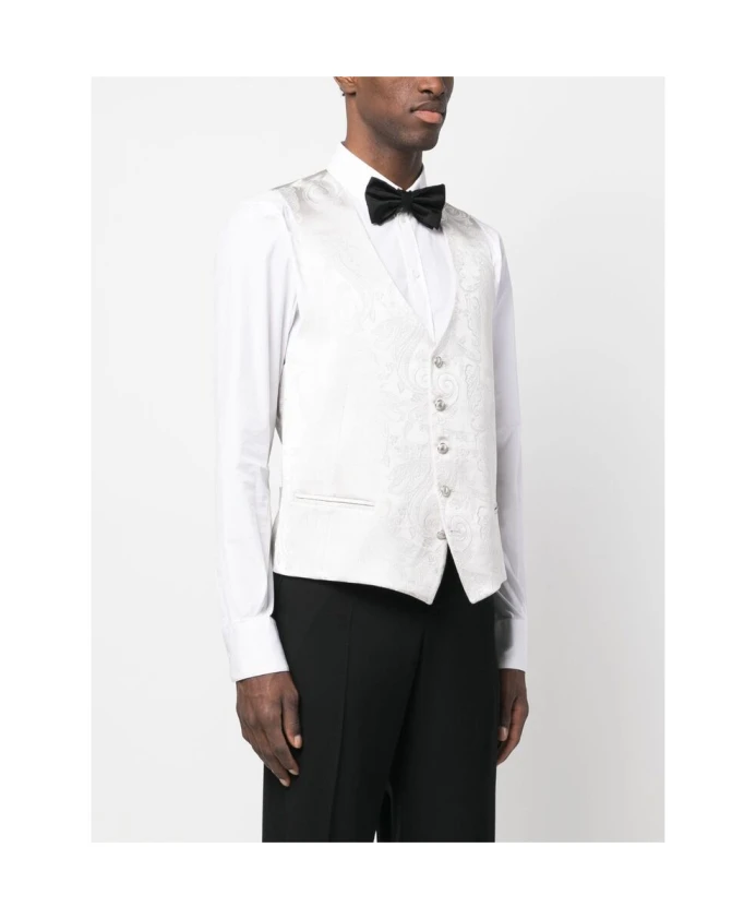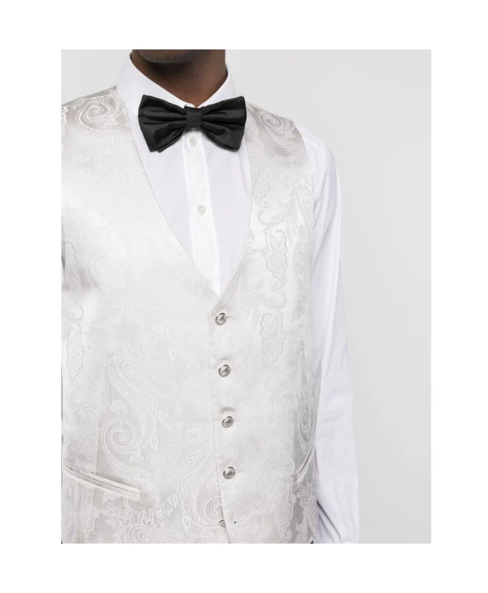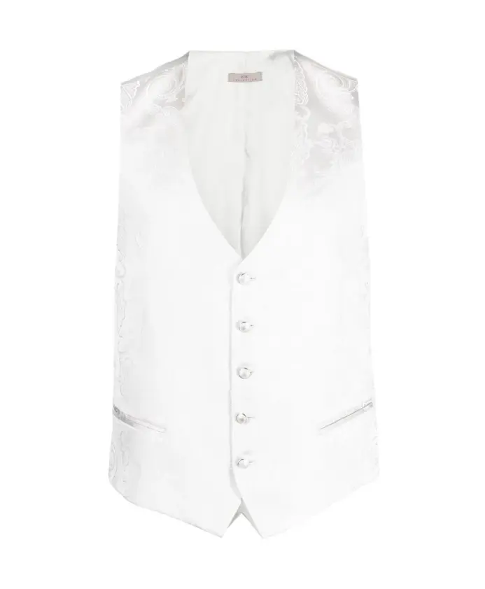 Дополните свой формальный образ этим кремово-белым шелковым жилетом из жаккарда от Lady Anne. Жилет с вставками, V-образным вырезом, застежкой на пуговицы спереди, двумя прорезными карманами, без рукавов, регулируемой спинкой и прямым низом станет стильным дополнением вашего гардероба.
