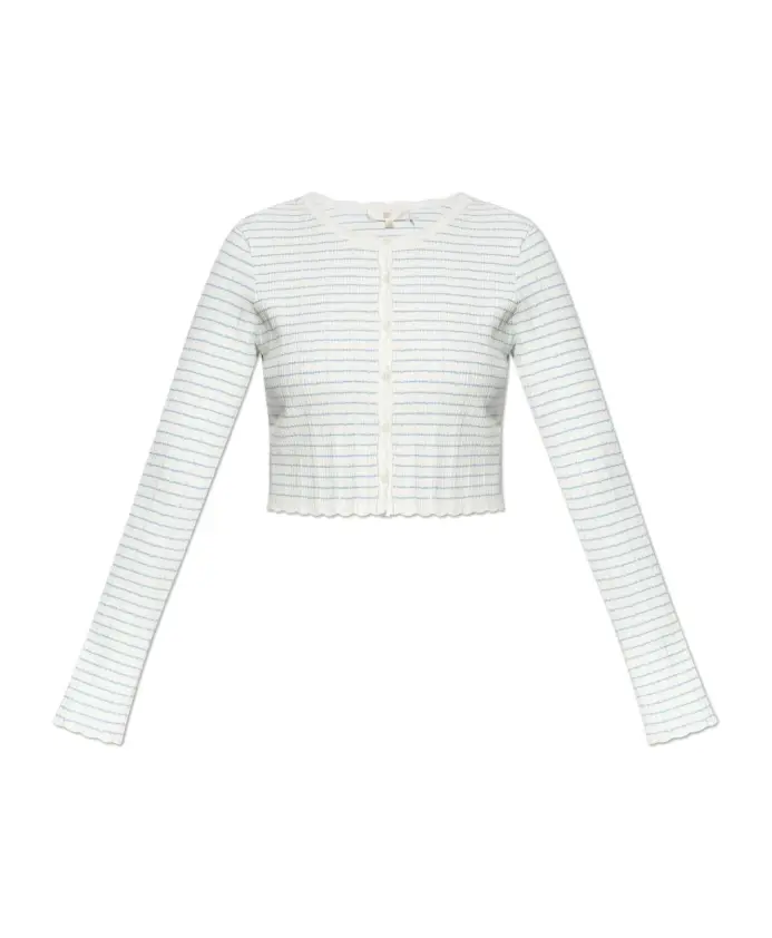 Кардиган "MEDIA" впечатляет своим утонченным минимализмом и изысканным мастерством исполнения. Короткий, приталенный силуэт, доходящий до талии, деликатно подчеркивает фигуру, а ребристый узор с приятной на ощупь текстурой радует своей мягкостью. Нежный узор из светло-голубых полосок на белоснежном фоне придает изделию утонченную элегантность, а маленькие белые пуговицы спереди, слегка волнистые манжеты и нижний край добавляют легкости и неповторимого характера. Отсутствие видимых надписей и логотипов подчеркивает изысканный дизайн и оставляет место для индивидуального стиля. Эта модель из коллекции LoveShackFancy гармонично сочетает современные тренды с вневременной формой, что делает кардиган "Media" идеальным выбором для ценителей неординарной элегантности. ПОЧЕМУ ЭТОТ ТОВАР СТОИТ КУПИТЬ? * Роскошная, мягкая трикотажная ткань в рубчик * Исключительные детали - волнистые края и элегантные пуговицы * Ненавязчивый узор и современные линии * Дизайн без видимых логотипов, гарантирующий сдержанную элегантность * Идеальный выбор как для дневных, так и для вечерних нарядов Параметры модели Рост: 177 см Обхват груди: 83 см Обхват талии: 61 см Обхват бедер: 89 см Модель носит размер: S