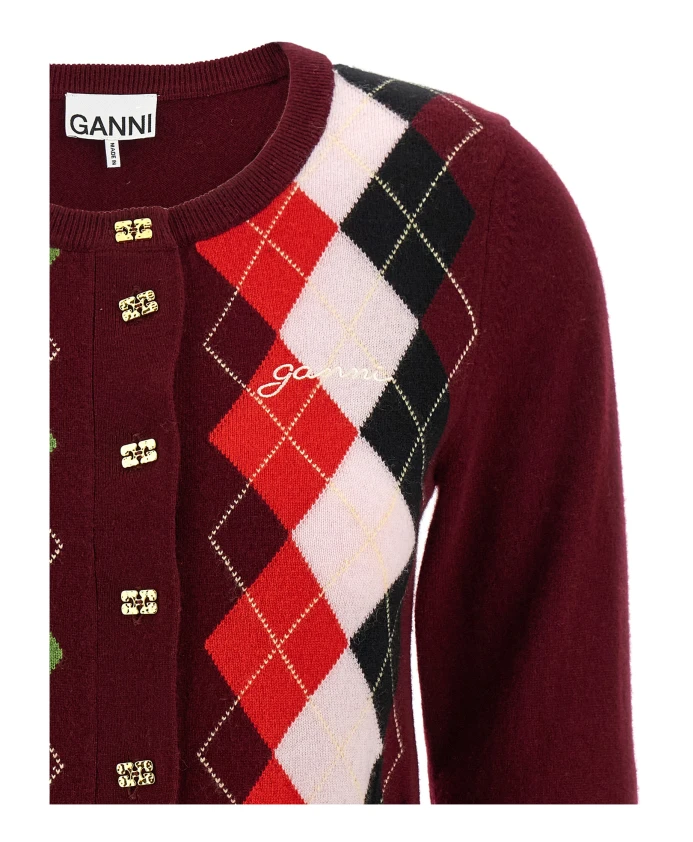 Кардиган Ganni в клетку из смеси мериносовой шерсти и кашемира с узором «аргайл» на передней части и вышитым логотипом для создания стильного многослойного образа. Создан для легкого тепла, имеет облегающий силуэт и практичные карманы. Ключевые особенности: Разноцветный | Бордовый | Мериносовая шерсть и кашемир | Застежка на золотистые пуговицы | Два передних кармана | Круглый вырез | Узор «аргайл» на передней части | Разноцветный клетчатый узор | Длинные рукава с манжетами | Ребристые края | Вышитый логотип GANNI | Размеры и посадка: Облегающий крой | Состав ткани и уход: 70% мериносовая шерсть | 30% кашемир | Только ручная стирка. Не отбеливать, не сушить в сушильной машине, не гладить и не подвергать химчистке. Сушить в горизонтальном положении. Использовать средство для шерсти. Не замачивать. Максимальная усадка 3-5%.